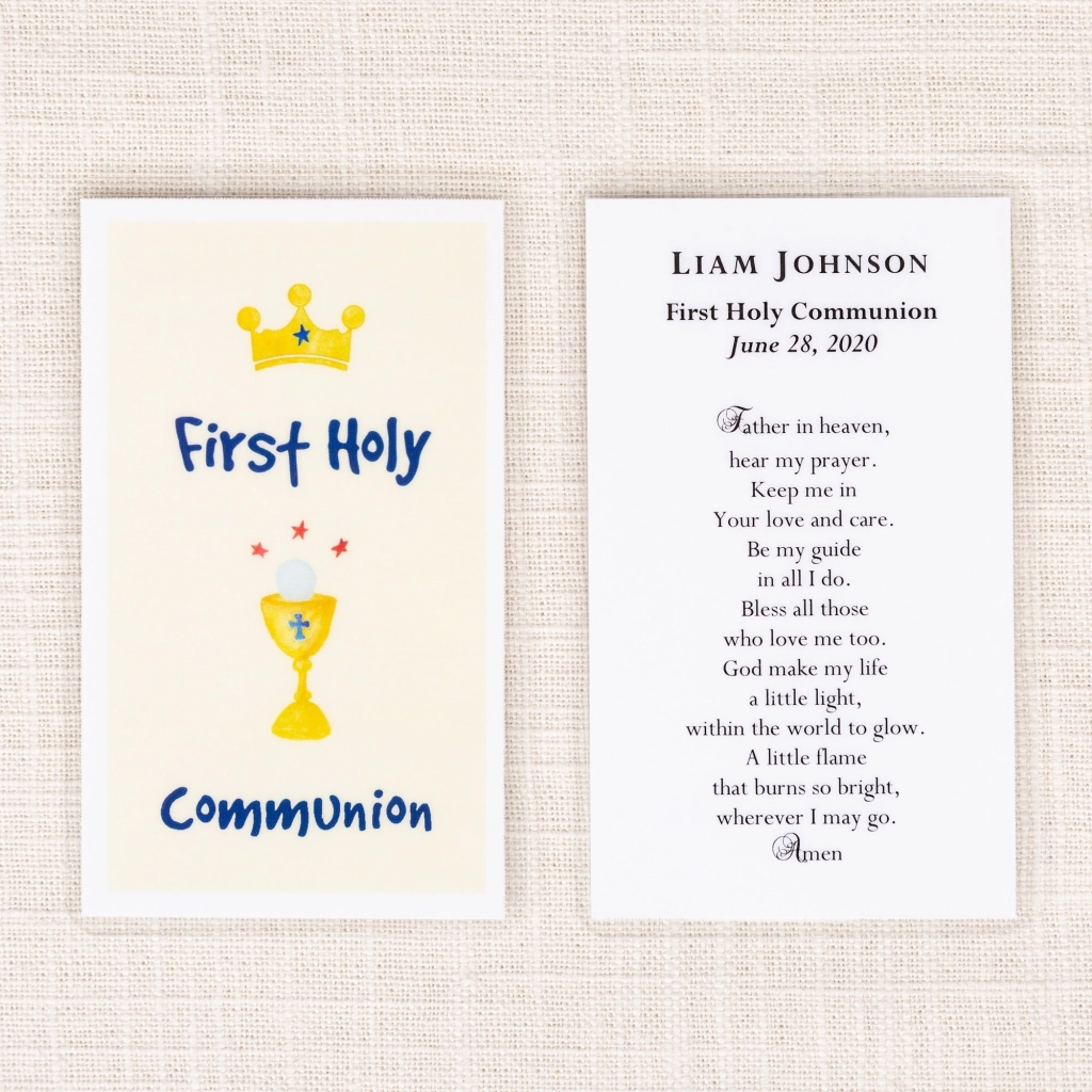 It's truly a special day when a child receives his First Holy Communion, and this prayer card helps you to celebrate the wonderful occasion. The charming design of the chalice goes perfectly with the crown, representing how Christ becomes king of your heart every time you receive the Eucharist. Personalization of the back of the card is included, making this a truly personal and unique gift.