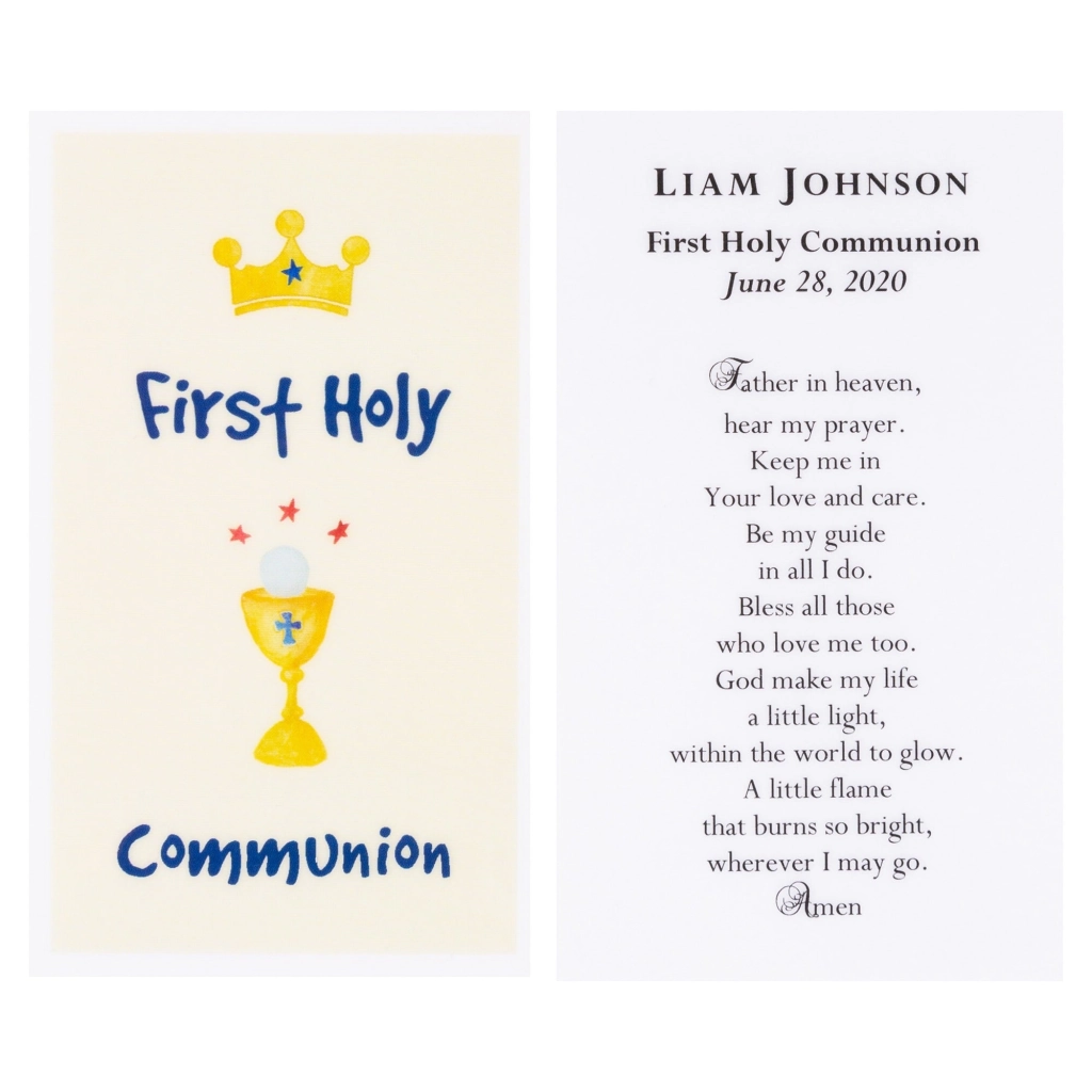 Celebrate a boy's First Holy Communion with this personalized watercolor prayer card from The Catholic Company. Featuring an elegant chalice and crown design, this 2.5" x 4.25" card allows you to add a personal message or prayer on the back, creating a unique keepsake. Orders require a minimum of 16 cards, priced individually, and must be placed in multiples of 8.