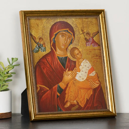 "Our Lady of Perpetual Help" is a revered icon depicting the Virgin Mary holding the Christ Child, who gazes at the angels presenting symbols of His future Passion. Mary's protective posture symbolizes her role as our intercessor, guiding the faithful to her Son.