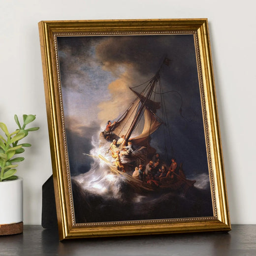 Theme and Composition: The painting captures the dramatic moment when Jesus and His disciples are caught in a violent storm on the Sea of Galilee. The boat is shown in the midst of tumultuous waves, with the disciples in various states of fear and desperation, while Jesus, waking from sleep, remains calm.
