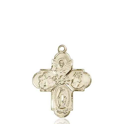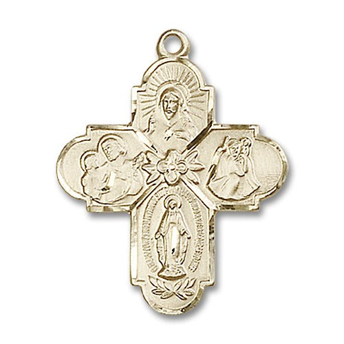 This exquisite 14kt Gold 4-Way Medal, measuring 1 x 7/8 inches and weighing 4.9 grams, is handcrafted in the U.S.A. The medal is guaranteed not to tarnish, ensuring its lasting brilliance. Chain not included, allowing you to choose your preferred style for personalizing this meaningful piece.