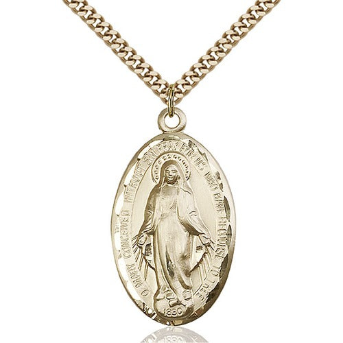 The 14kt Gold Filled Miraculous Pendant offers the elegance of solid 14K gold without the high price. Measuring 1 3/8" x 3/4", it comes with a durable 24" stainless gold heavy curb chain and clasp. Hand-made in the U.S.A. and guaranteed not to tarnish, it's a beautiful, lasting piece of devotional jewelry.