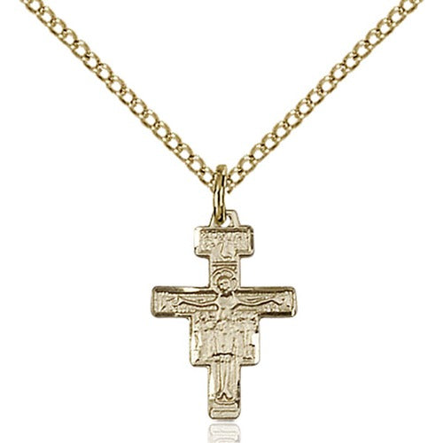 Experience the elegance of the 14kt Gold Filled San Damiano Crucifix Pendant, showcasing the appearance of solid gold without the hefty price tag. This hand-made piece, featuring a 14kt Gold Filled Lite Curb 18" chain, is tarnish-resistant and crafted in the U.S.A., offering a beautiful and lasting symbol of faith.