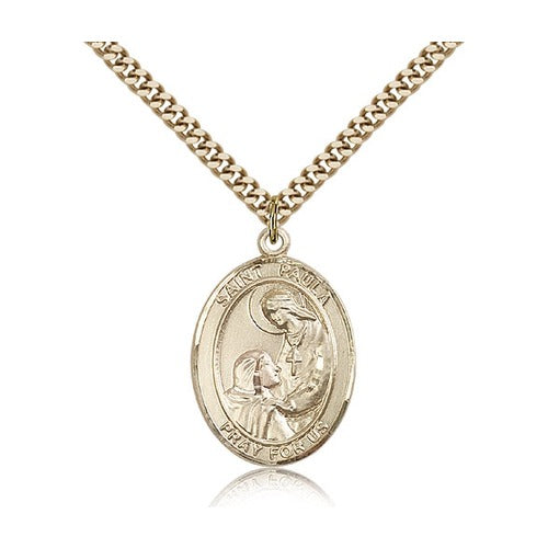 14kt Gold Filled St. Paula Pendant on a 24'' Stainless Gold Heavy Curb Chain with clasp. 14kt Gold Filled, the look and feel of solid 14klt Gold at a fraction of the price. Size: 1 x 3/4 inches.