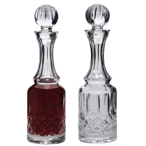 This set of 2 decoratively etched lead crystal cruet bottles comes with glass stoppers. Cruets are used to hold the water and wine prior to the consecration during mass.