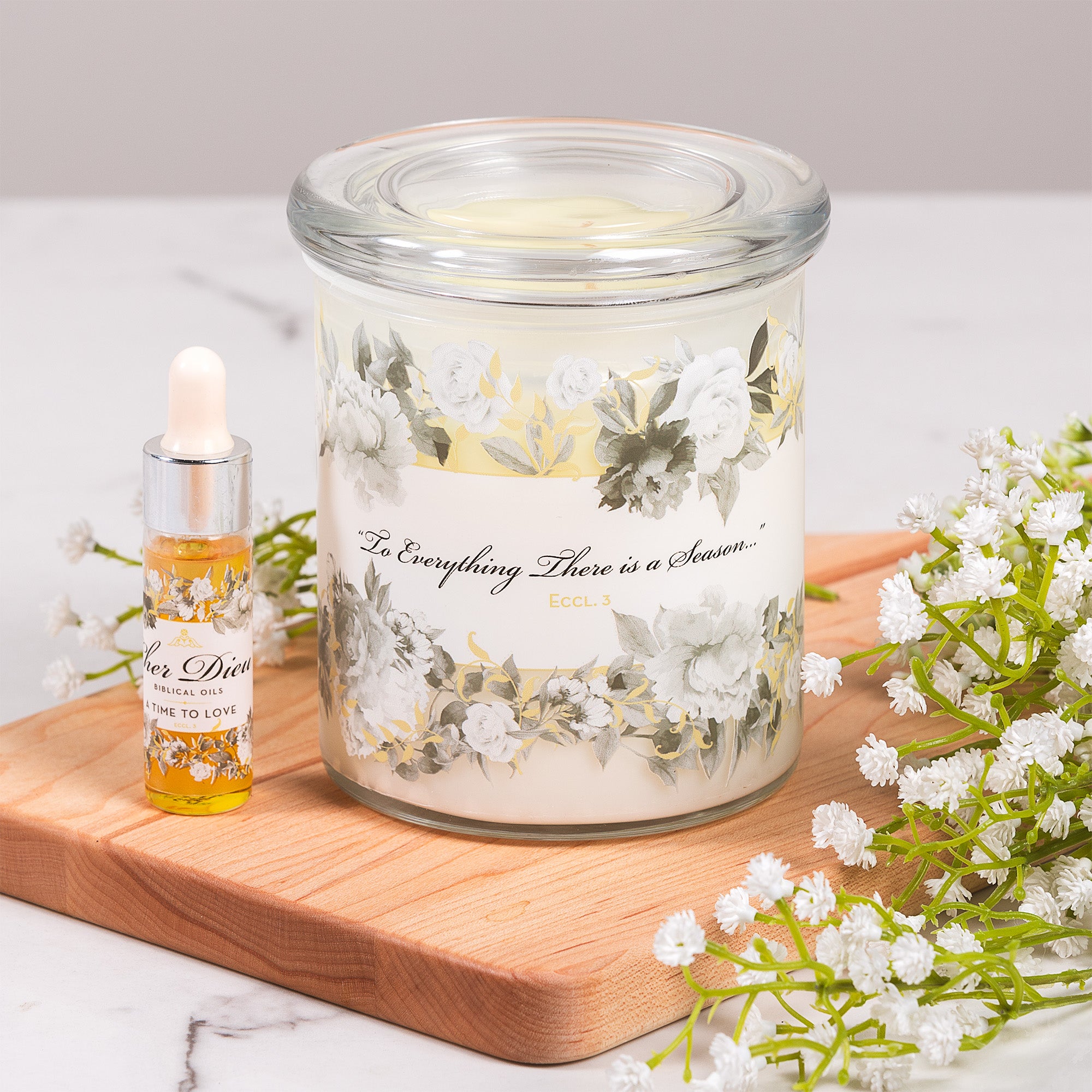 The "A Time to Love" Candle & Oil Gift Set enhances any special occasion with its beautifully infused natural oils. Featuring a botanical candle and essential oil, this set combines Frankincense, Galbanum, Rose, Hyssop, and Spikenard to elevate the spirit. A perfect gift of love, faith, and inspiration, ideal for housewarming, hostess gifts, or personal devotion.