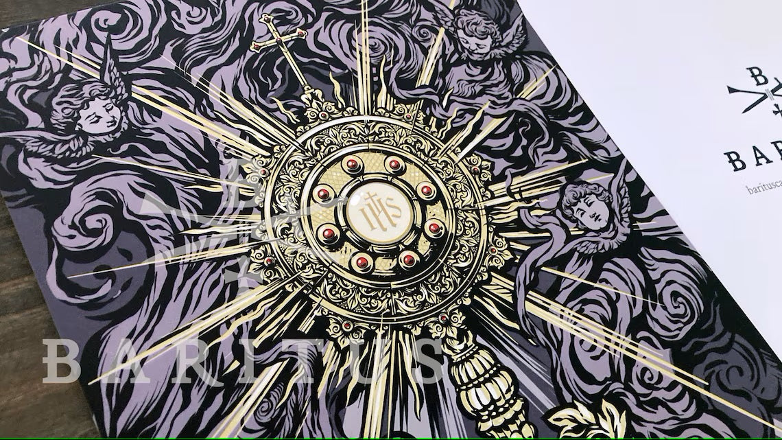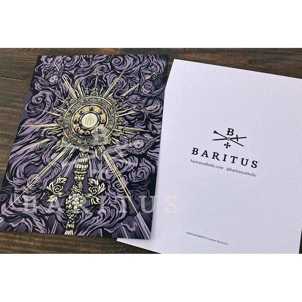 This bold and striking unframed print features original artwork by BARITUS Catholic Illustration, showcasing a golden monstrance illuminated by angelic adoration. With intricate detail and brilliant color, it serves as a moving devotional piece. Printed on high-quality art paper with a matte finish, it makes a unique gift or a sacred space accent. Made in the USA, measuring 8.5" x 11".