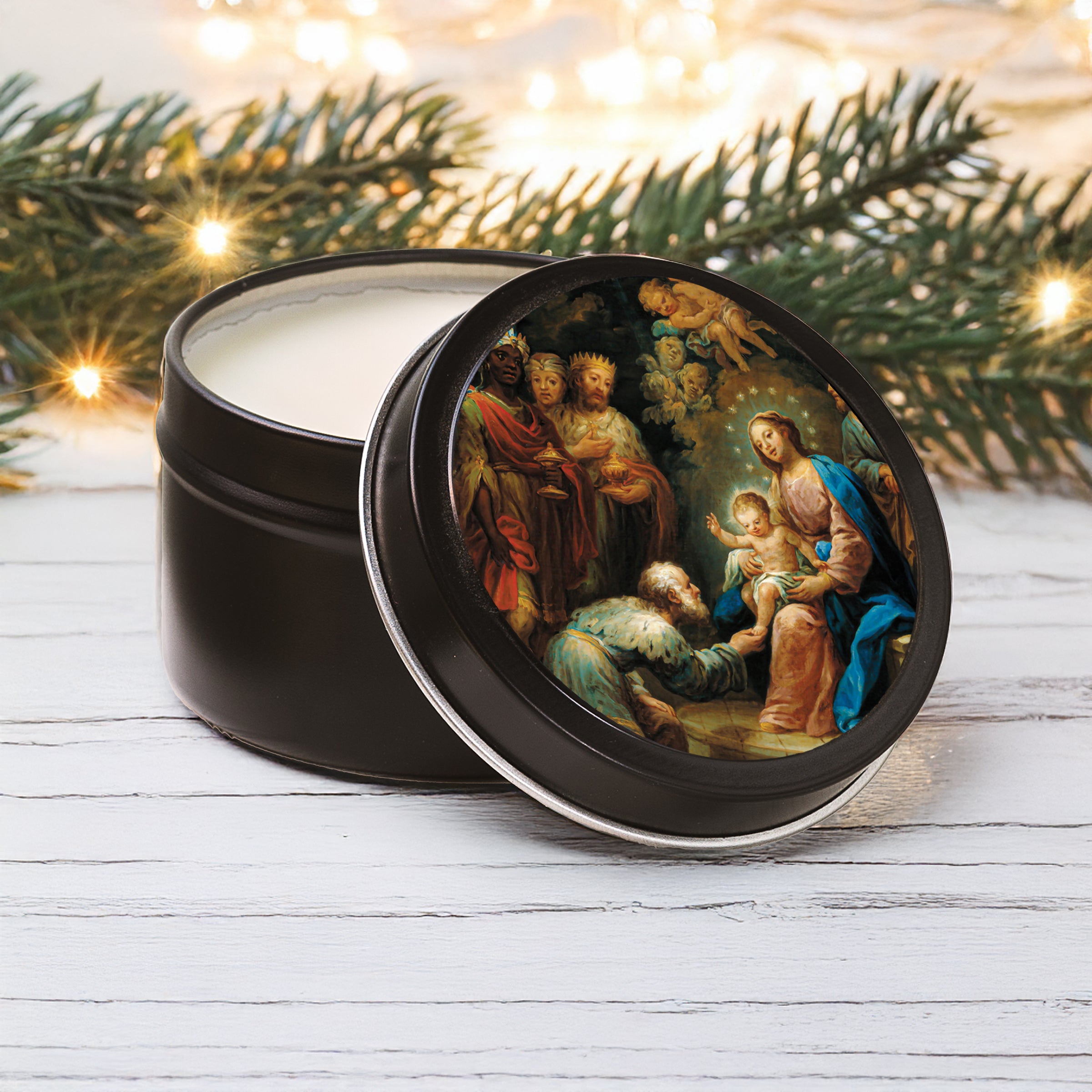 The Adoration of the Magi Candle Tin is a nativity-themed, travel-sized candle in a matte black tin, exclusive to The Catholic Company. Featuring artwork by Jeronimo Ezquerra, it emits a crisp Christmas Tree scent with balsam and pine notes, ideal for prayer, relaxation, or home decor. This elegant, portable candle offers peace and joy, making it a perfect gift for Christmas or any special occasion.