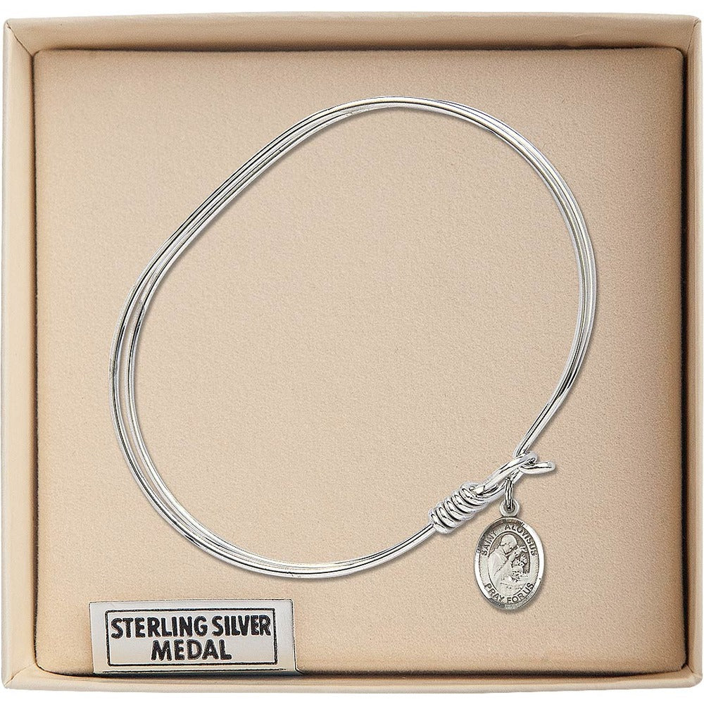 Adult 7" Oval Rhodium Plated Bangle Bracelet with St. Aloysius Gonzaga Medal Charm