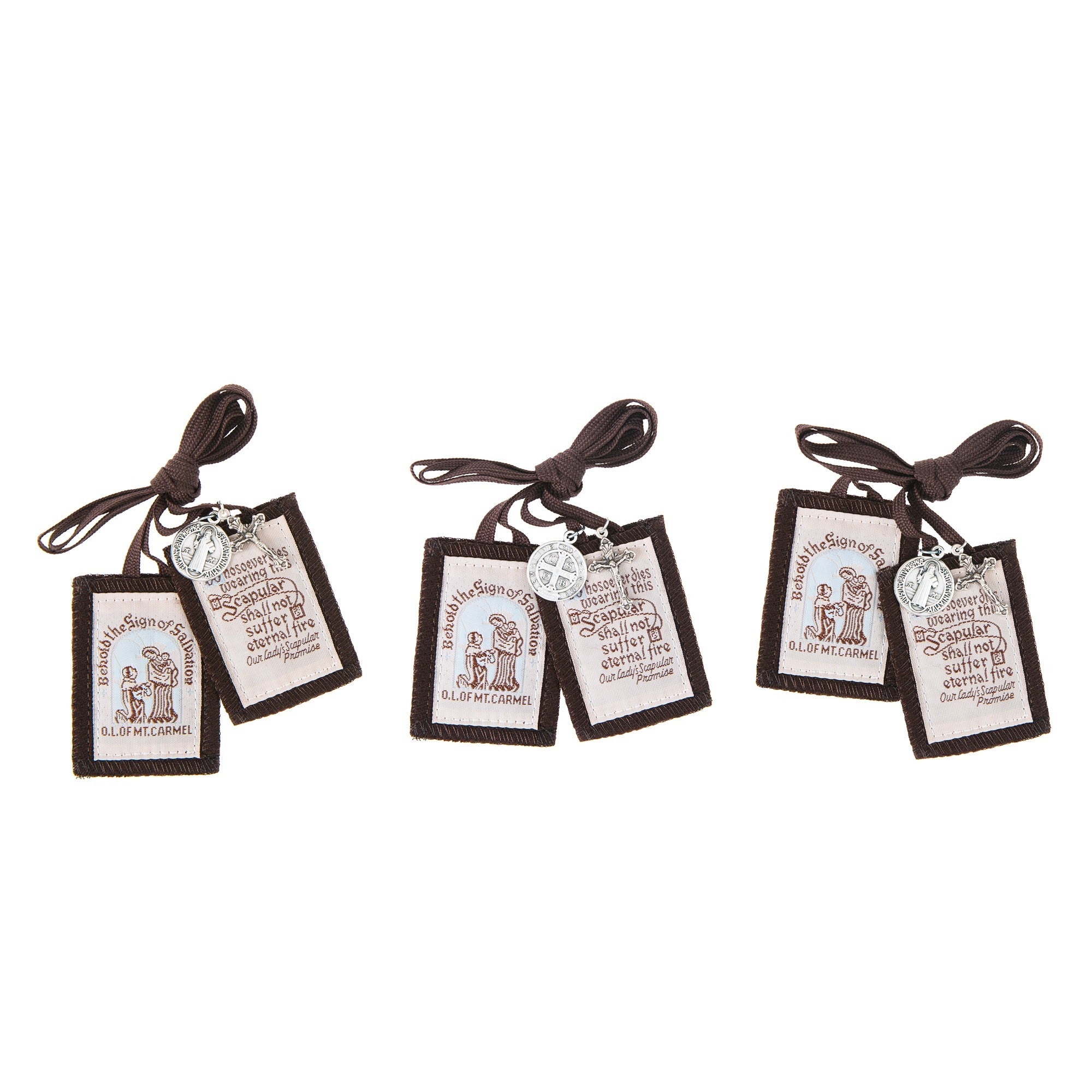 This set of three handmade woolen Brown Scapulars for adults features a Jubilee Medal Cross of St. Benedict and an image of Our Lady with St. Simon Stock. Each scapular includes the associated promises and prayers. With a total length of 21.5", personalization is available, engraved on silver charms. Ideal for deepening your Catholic faith.