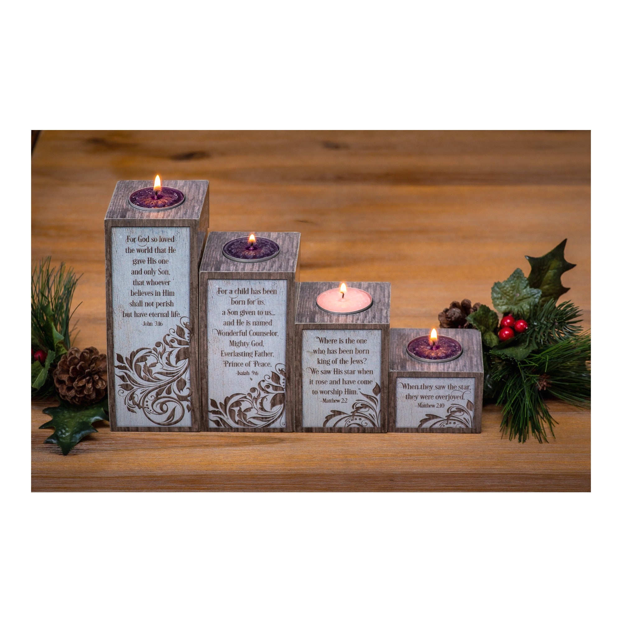The Advent Pillar Set features four pillars that create an elegant centerpiece. Whitewashed finish is simple and stylized to coordinate with any decor.The pillars are graduated in height and can be arranged as you choose. Each pillar is decorated with a virtue that is especially appropriate for the Christmas season: Peace, Love, Hope, and Joy. Includes an Advent brochure, 3 purple and 1 pink tealights.