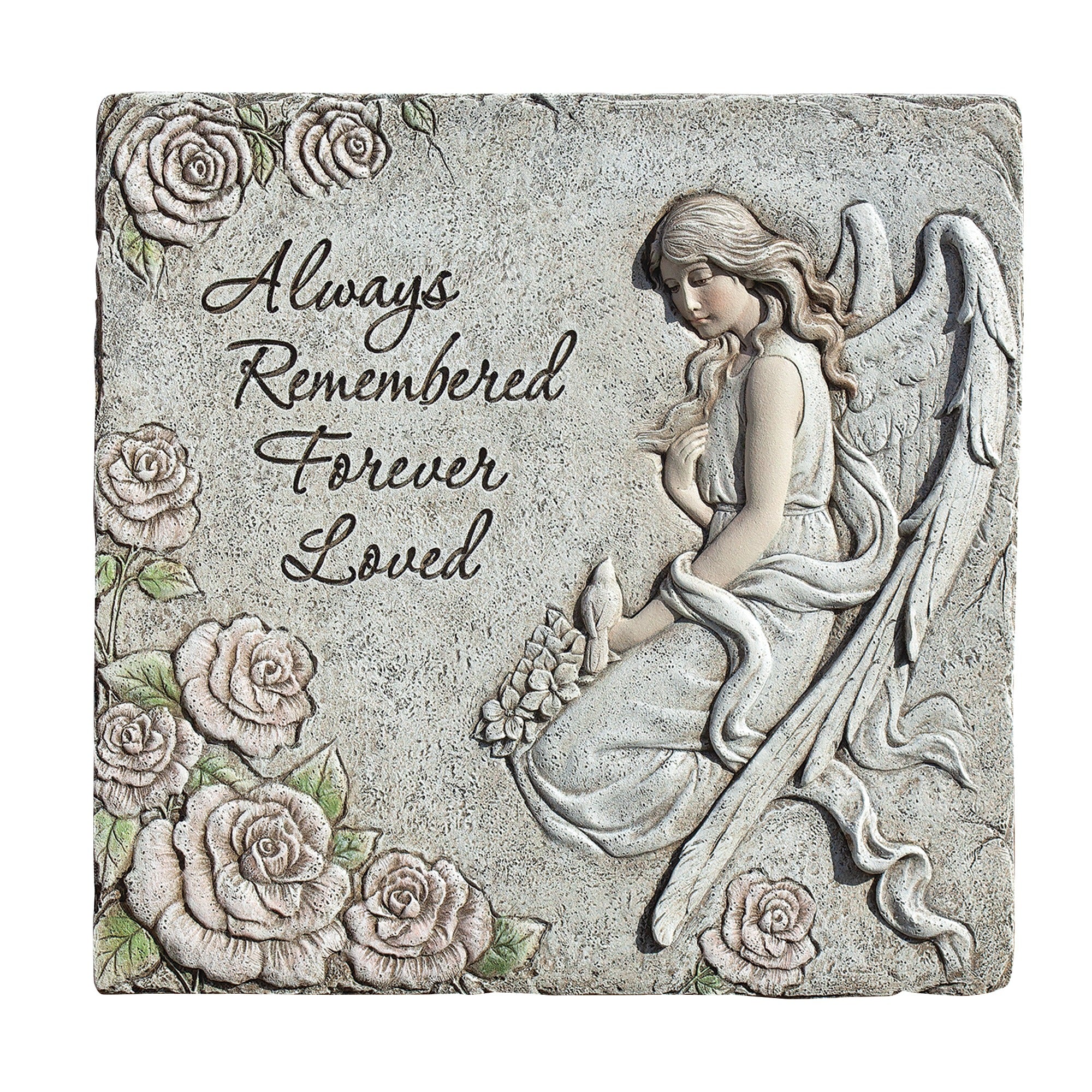 This garden stone is a special way to memorialize a loved one or acknowledge a loss. It is serenely accented with a praying angel, hand on her heart, holding a dove. She prays at a rose garden in peace and holy confidence. In pastel tones of grey with light peach, fair pink, and pale green accents. Reads "Always remembered, forever loved."