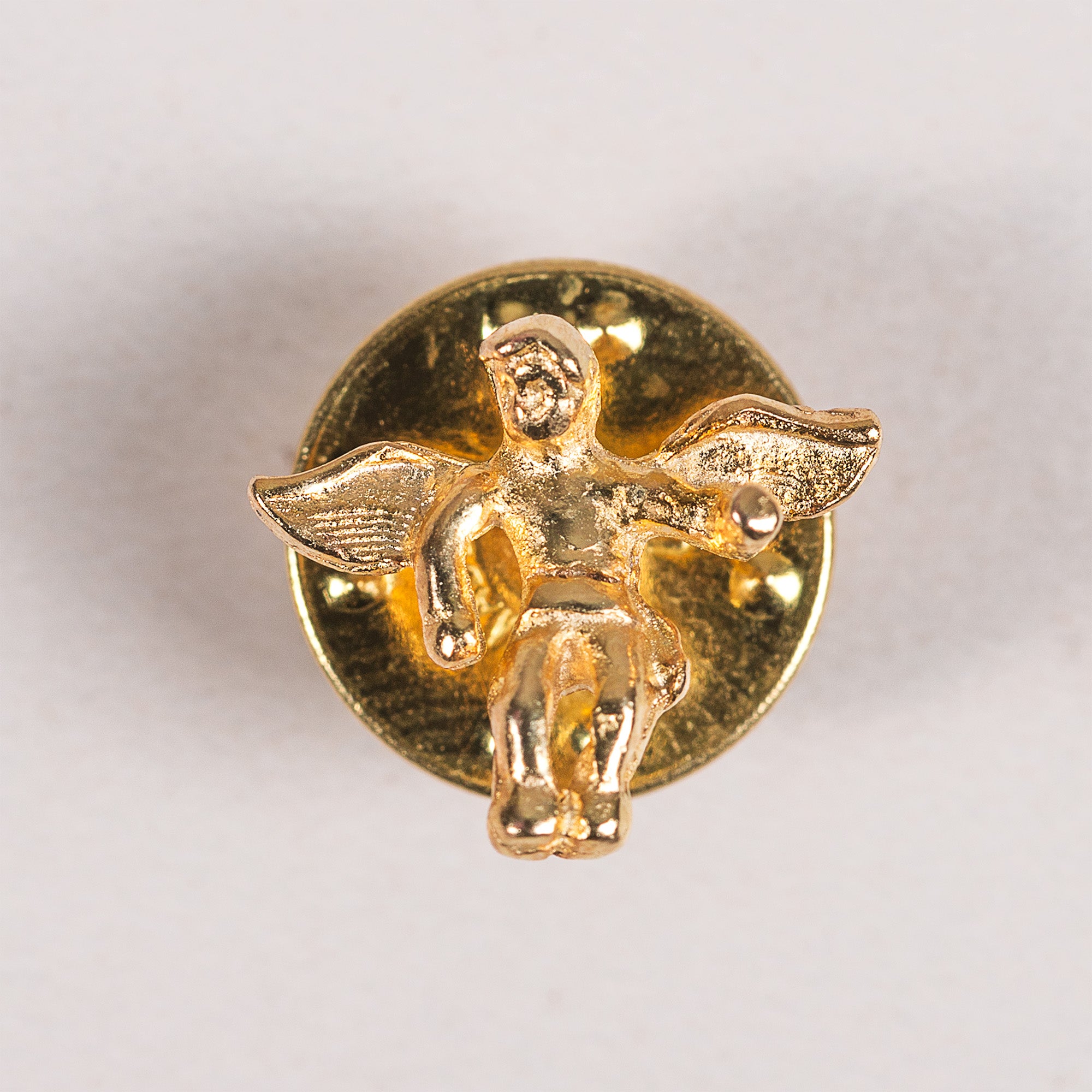 Gold-tone Angel Pin, comes on a card. The card reads: "Angel on my Shoulder A Guardian Angel to watch over me." Made in the USA.