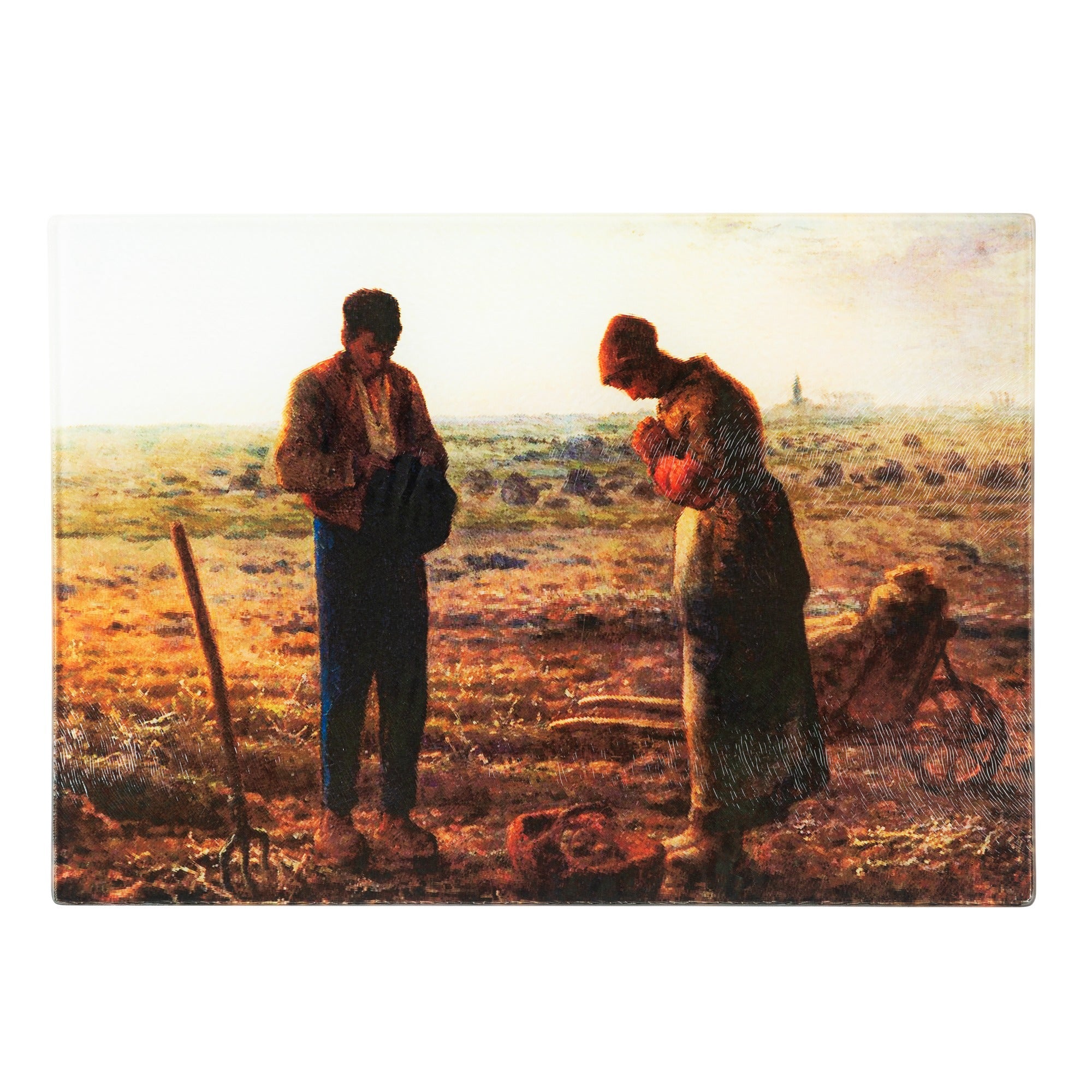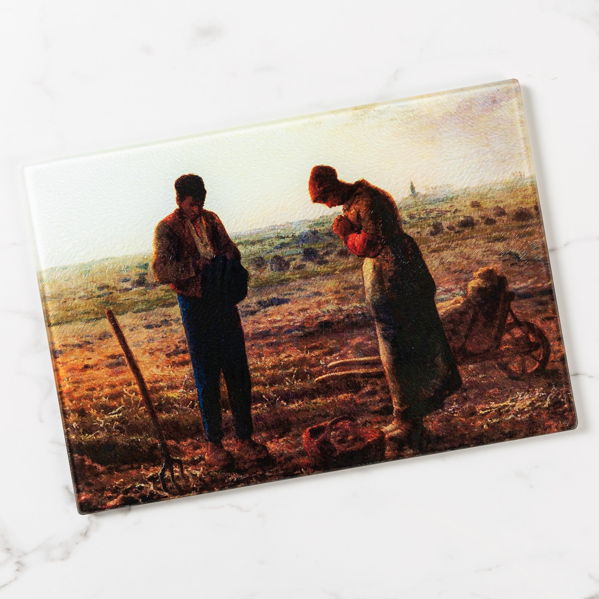 Give a cheerful, practical gift that is sure to be used and cherished! This glass cutting board features the vibrant scene from Jean-Francois Millet's 1850s "The Angelus" painting. The rubber grips on the bottom corners will help prevent slipping and cracking. This glass board makes a memorable gift for a hostess, housewarming, or bridal shower. Use it as a platter for cheeses, cookies or other fun foods while you reflect on sanctifying daily tasks, even those in the kitchen!