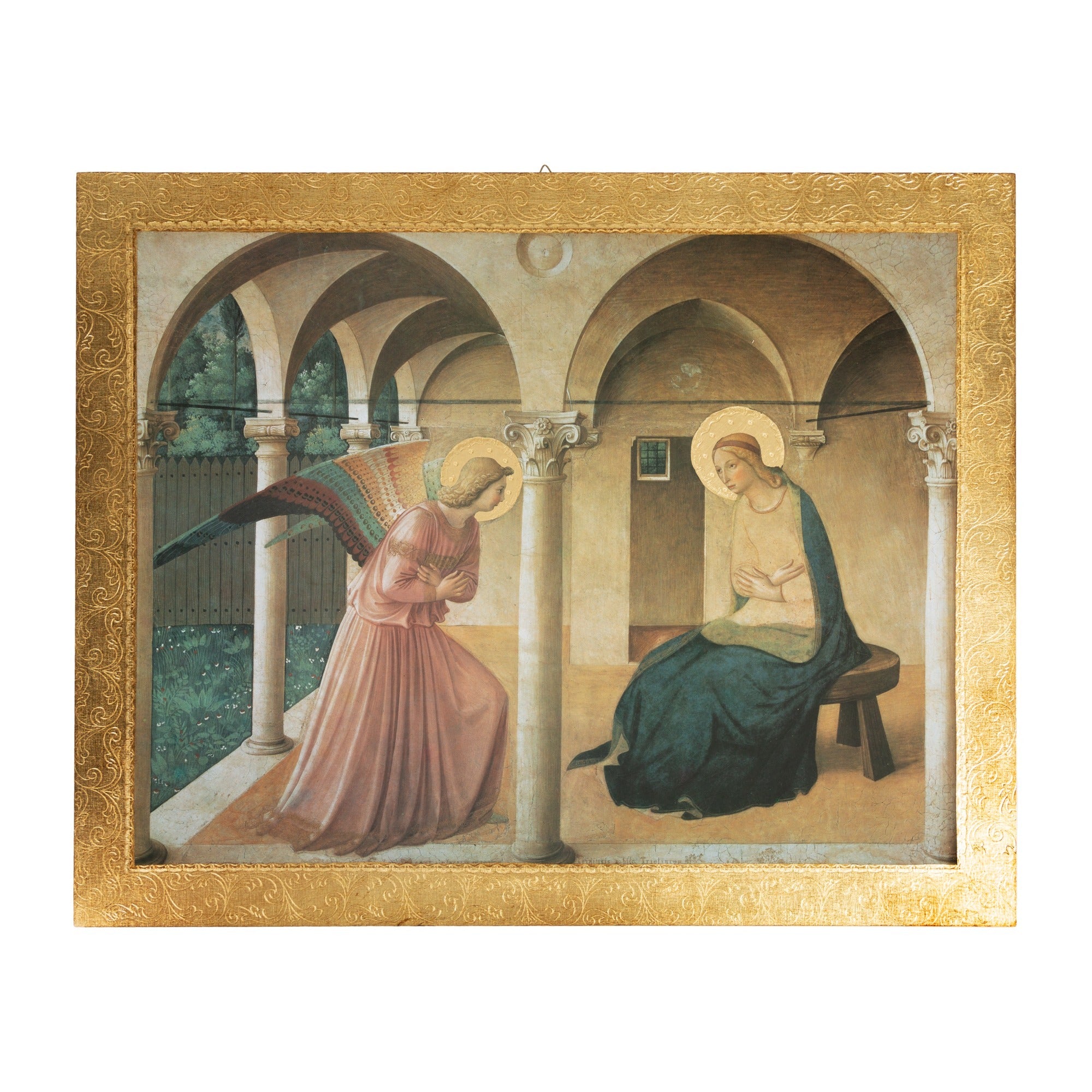 This stunning Italian plaque features a reproduction of "The Annunciation" by Fra Angelico, showcasing serene colors and elegant gold leaf accents. A timeless gift celebrating devotion to Mary, this plaque is crafted in Italy, embodying the tradition of ancient artisans. Perfect for those who cherish Our Lady, it inspires saying "Yes" to God daily. Dimensions: 15.75" H x 19.75" W.