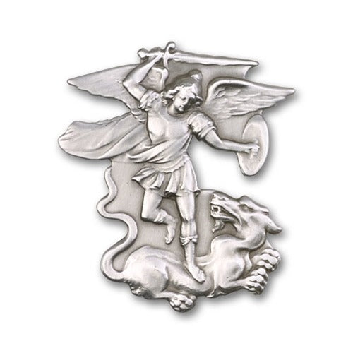Keep St. Michael close on your travels with this Antique Silver Visor Clip, measuring 2 x 1¾ inches. Designed as a perfect religious auto accessory, it offers protection and patronage, particularly for police officers and EMTs.