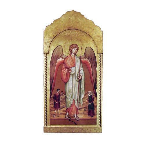 The Archangel Raphael Plaque is a striking Italian-made artwork that measures 21 inches wide, 3 inches deep, and 45 inches high. Its Florentine design beautifully captures the essence of Archangel Raphael, making it a stunning addition to any space.