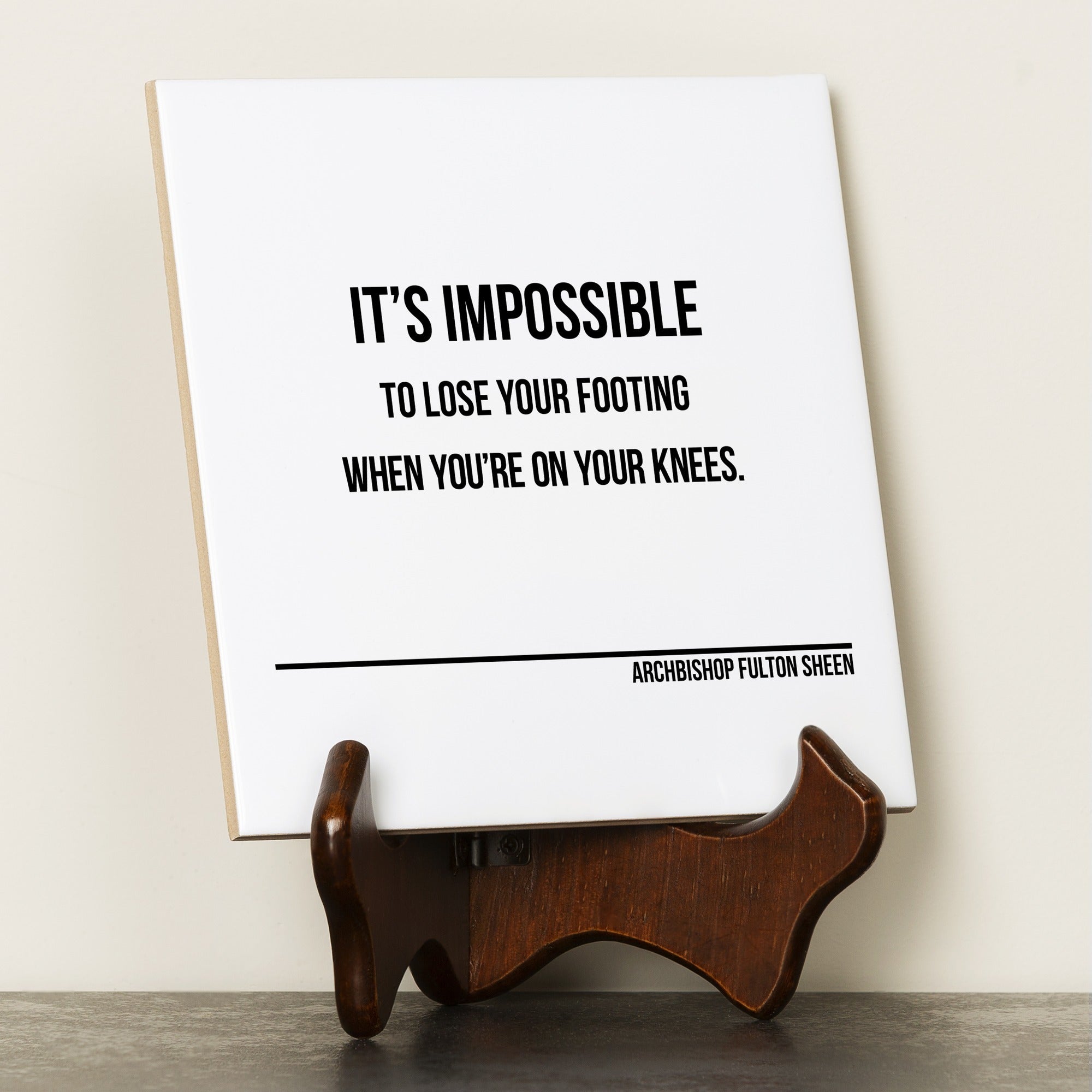 This charming tile makes a wonderful addition to the Catholic kitchen. The quote by Sheen reads: “It’s impossible to lose your footing when you’re on your knees,” reminding us of the power of prayer in overcoming our daily difficulties. This piece can be used as a practical trivet and also displayed as thought-provoking decor! Includes 4 no-slip rubber feet. Separate display easel sold here.