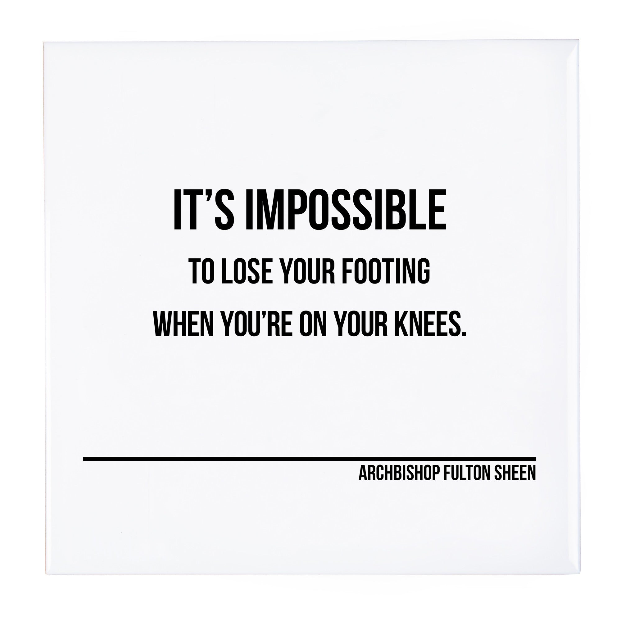 The Archbishop Fulton Sheen On Your Knees Tile is a glossy ceramic piece featuring a striking image and inspiring quote by Sheen, "It's impossible to lose your footing when you're on your knees." Ideal for display or as a trivet, this exclusive item by The Catholic Company includes no-slip rubber feet and adds a thoughtful touch to any Catholic kitchen. Easel sold separately.