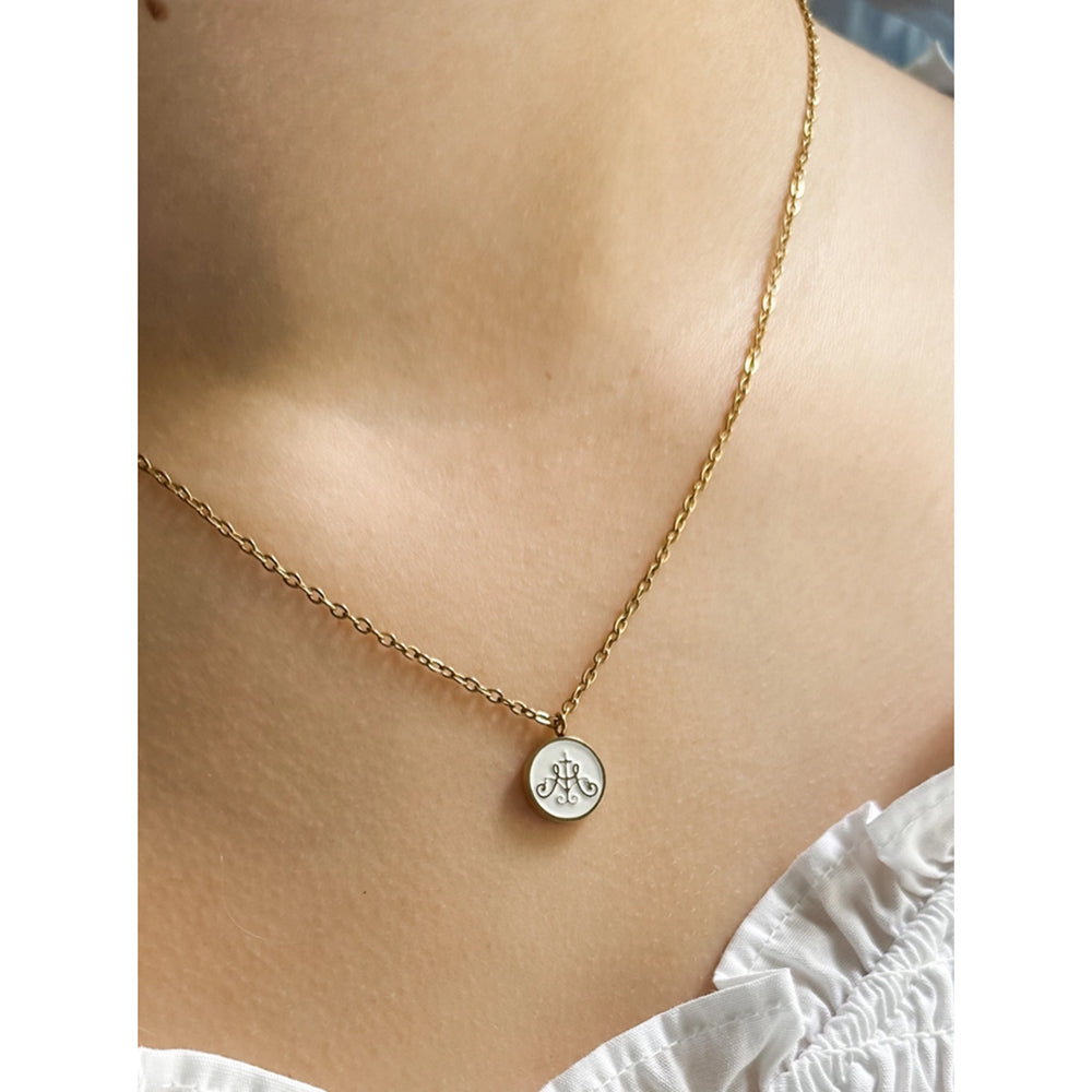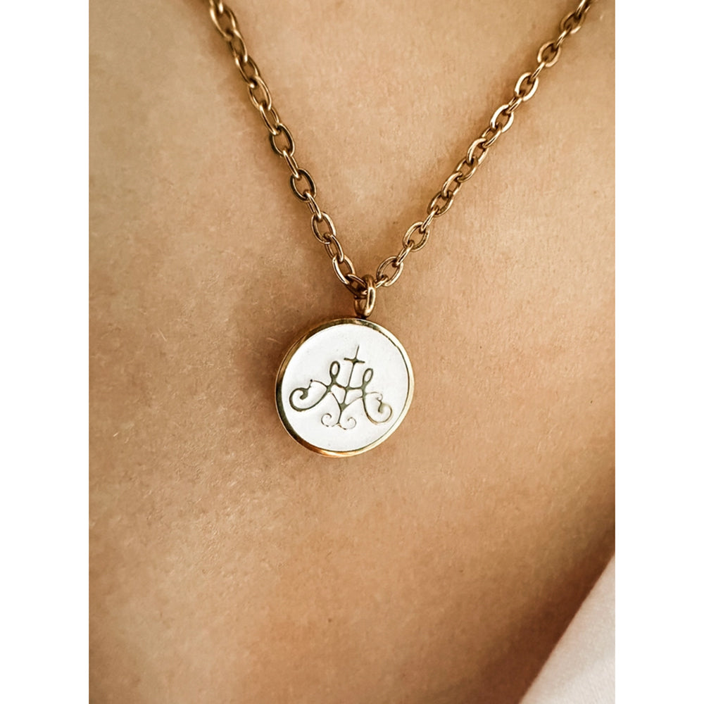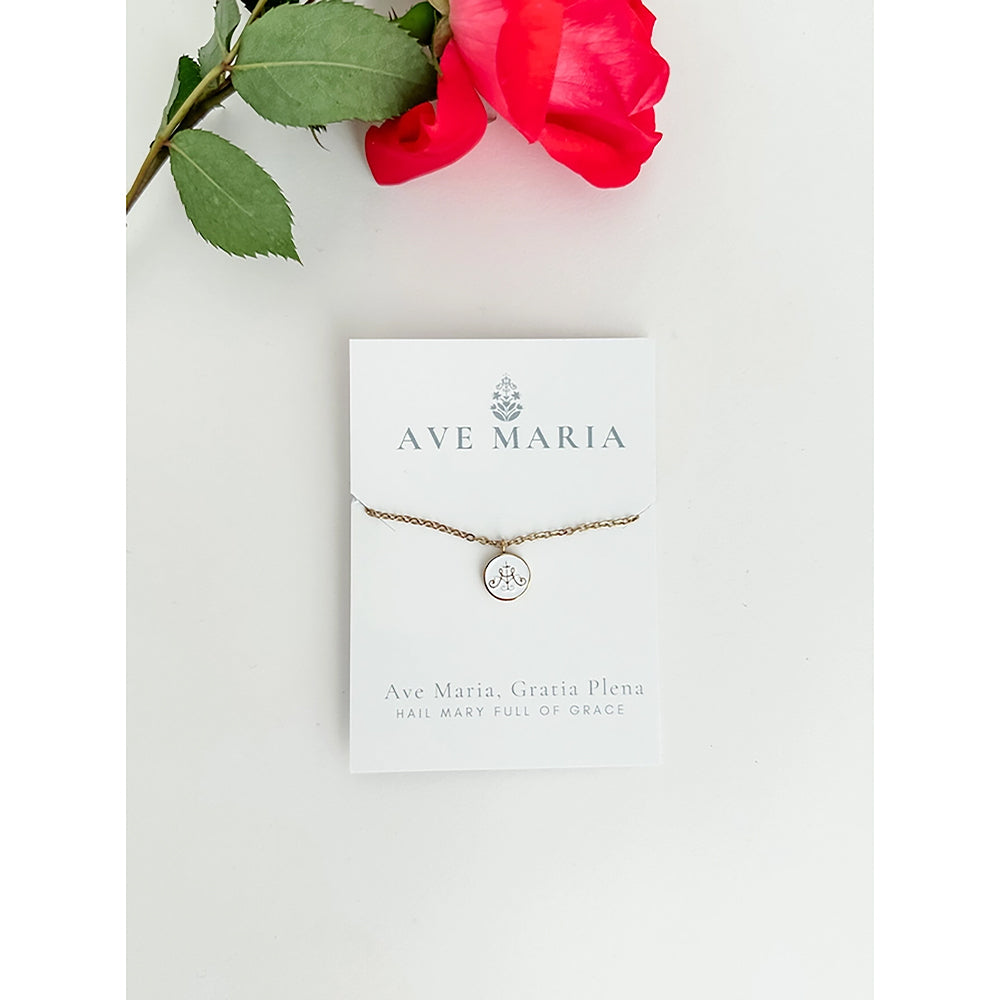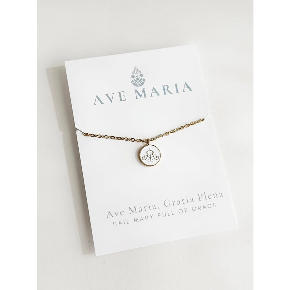 The Ave Maria Necklace is a delicate expression of faith, gracefully designed for everyday wear. Featuring a unique Marian monogram in white enamel and gold, it blends tradition with modern style to complement any outfit. Ideal for both casual and formal occasions, it comes packaged beautifully, making it a heartfelt gift. Made from tarnish-resistant, hypoallergenic stainless steel with 18K gold plating, it measures 17.5" with a 2" extender.