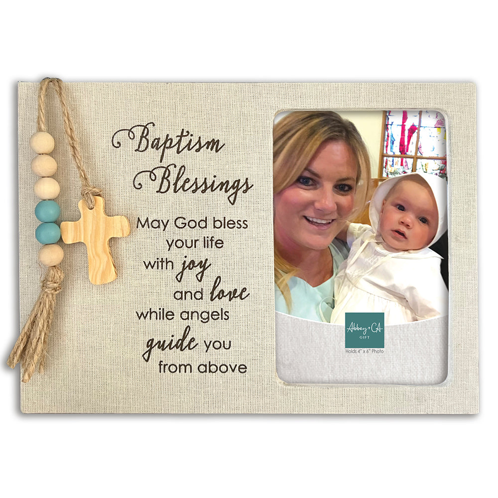 This 4" x 6" Baptism frame features neutral tones, a wooden cross, and beaded accents in your choice of pink or blue. Imprinted with a heartfelt blessing, it’s a meaningful keepsake and a cherished gift for a child’s special sacramental day.
