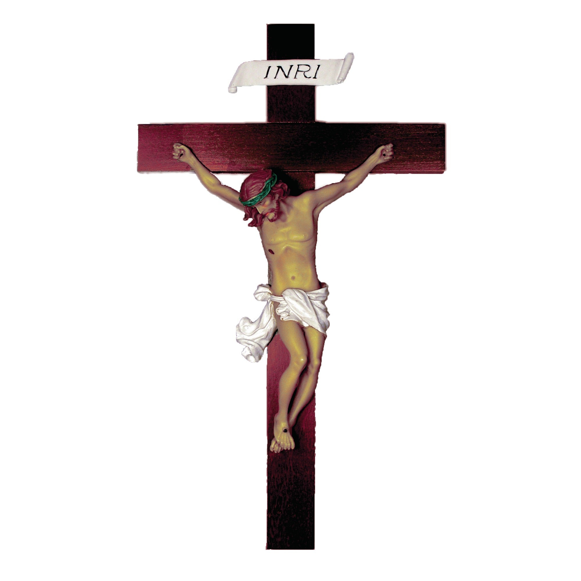 The 14" Baroque Crucifix features a beautifully hand-painted alabaster and resin corpus on a wooden cross. Crafted with care in Italy, this striking piece measures 8" wide, 3" deep, and 14" high, making it a perfect addition to any sacred space.