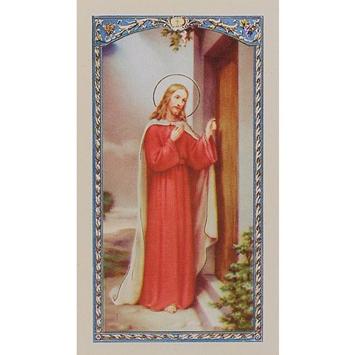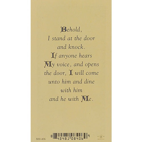 This durable laminated prayer card features a beautiful image of Jesus knocking at a door, inspired by Revelation 3:20. The reverse side includes an inspiring prayer, inviting you to welcome His presence. Measuring 2.5" x 4.5", this Italian-made card showcases artwork by Fratelli Bonella, making it a cherished spiritual keepsake.