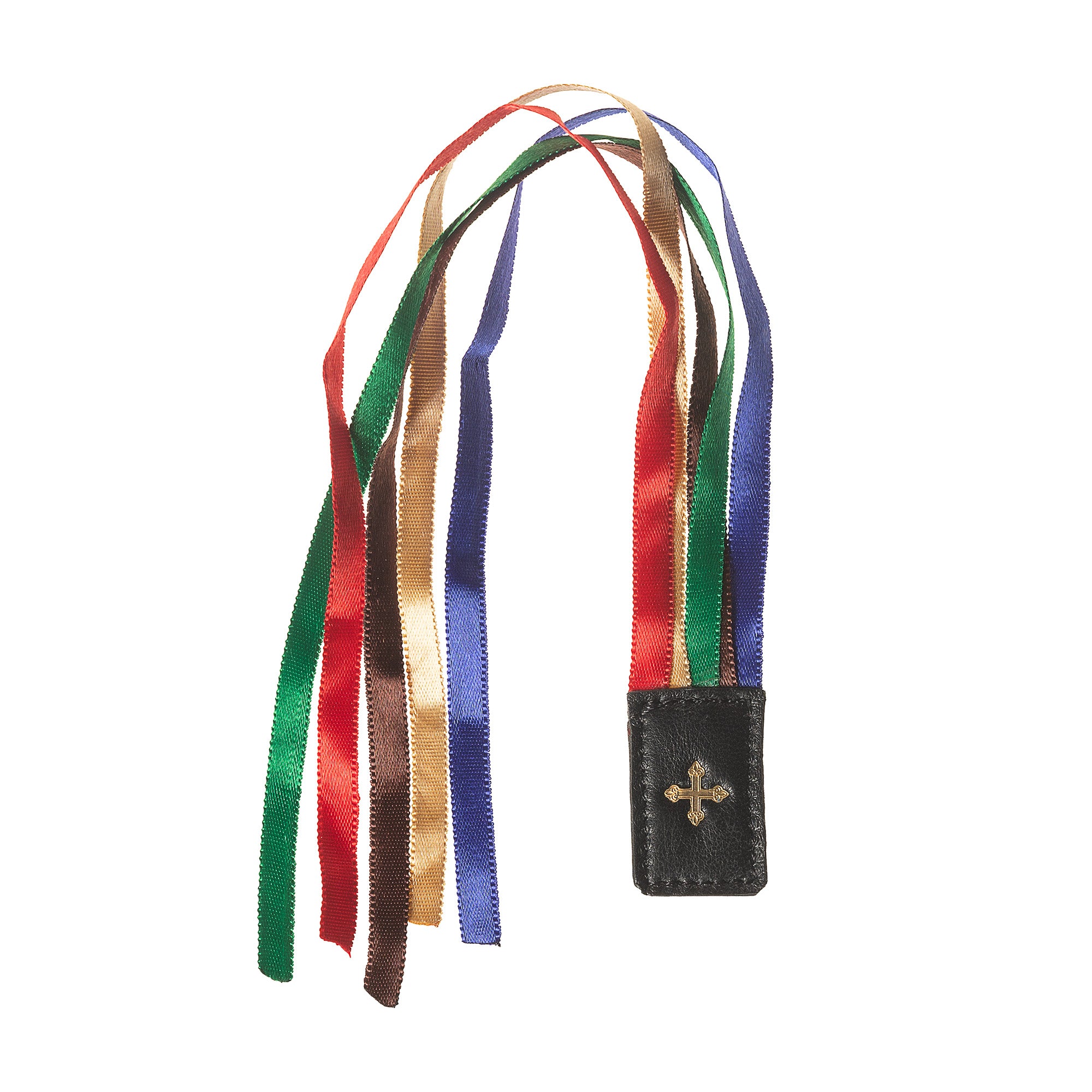 The Bible & Missal 5 Ribbon Bookmark features five vibrant satin-feel ribbons in red, gold, blue, green, and purple. Equipped with a leather slider for easy placement, it organizes your Bible, Missal, or Divine Office. At 11 inches long, it is both practical and thoughtful, making it a perfect gift for book lovers seeking a touch of elegance.