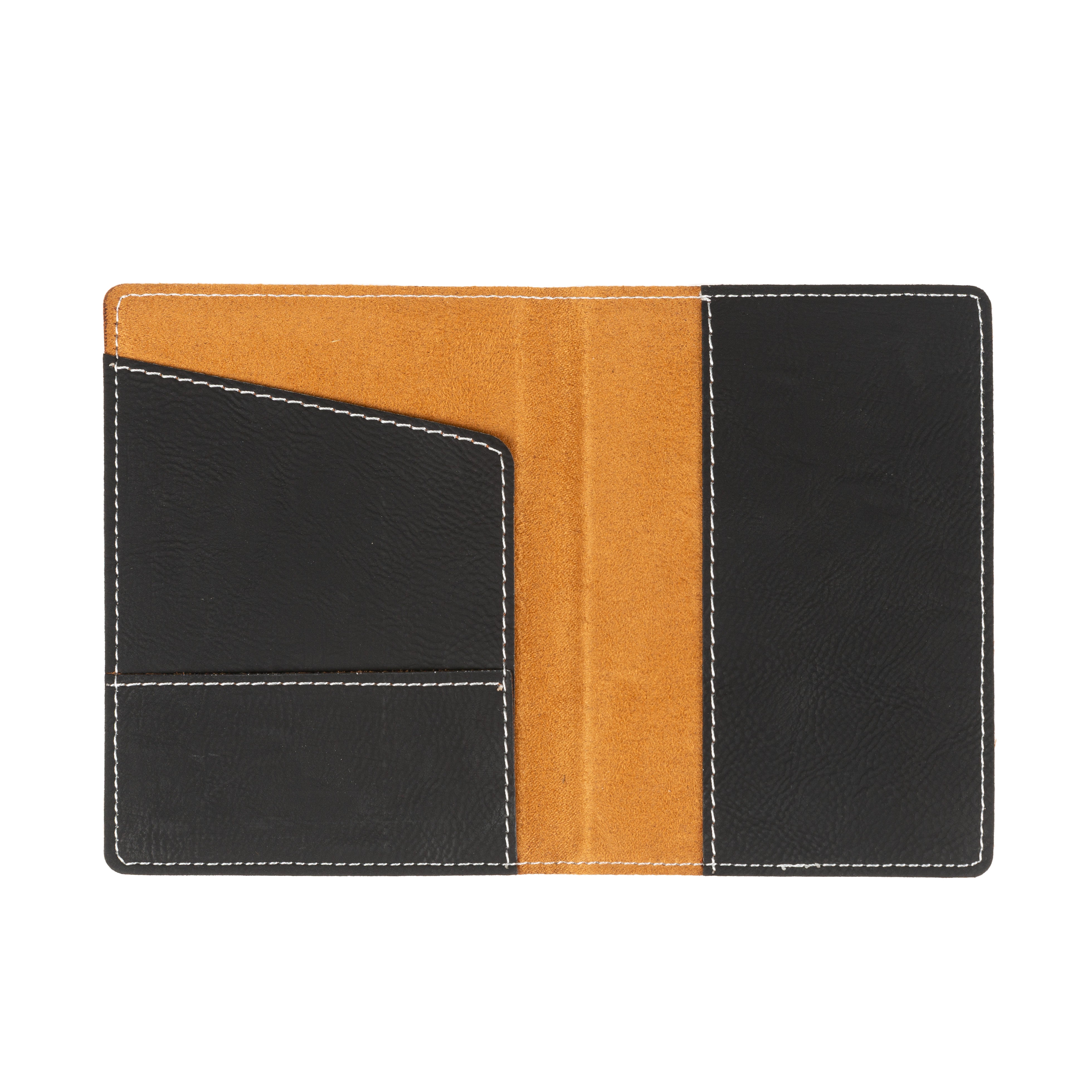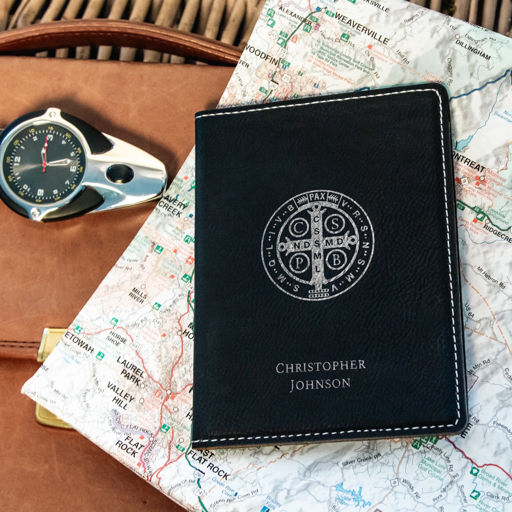 The Black St. Benedict Passport Cover combines elegance and spirituality, featuring the St. Benedict Jubilee Medal in silver foil. Crafted from richly textured black leatherette with detailed stitching, it includes caramel velveteen interior pockets for secure storage. This exclusive Catholic Company design offers free personalization, making it a meaningful, high-quality gift that invokes St. Benedict's protection.