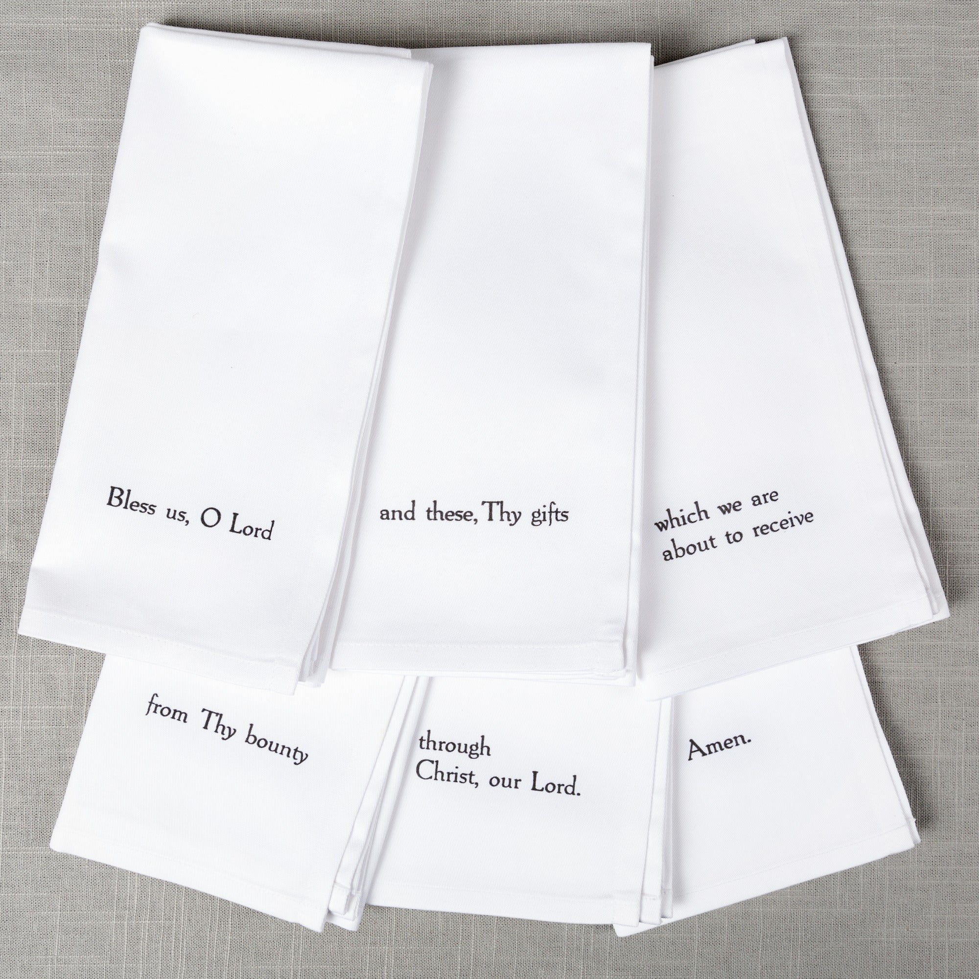 True hospitality is all in the details! Set a table that shows style and faith with this fresh, white napkin set. Made from Egyptian cotton, each napkin displays a single line from a beloved mealtime prayer. This contemporary, simple, and exclusive design will bring thoughtful blessings to your home and table. A thoughtful gift suited for every occasion. A practical conversation piece that invites family and guests to a moment of prayer before the meal is served.