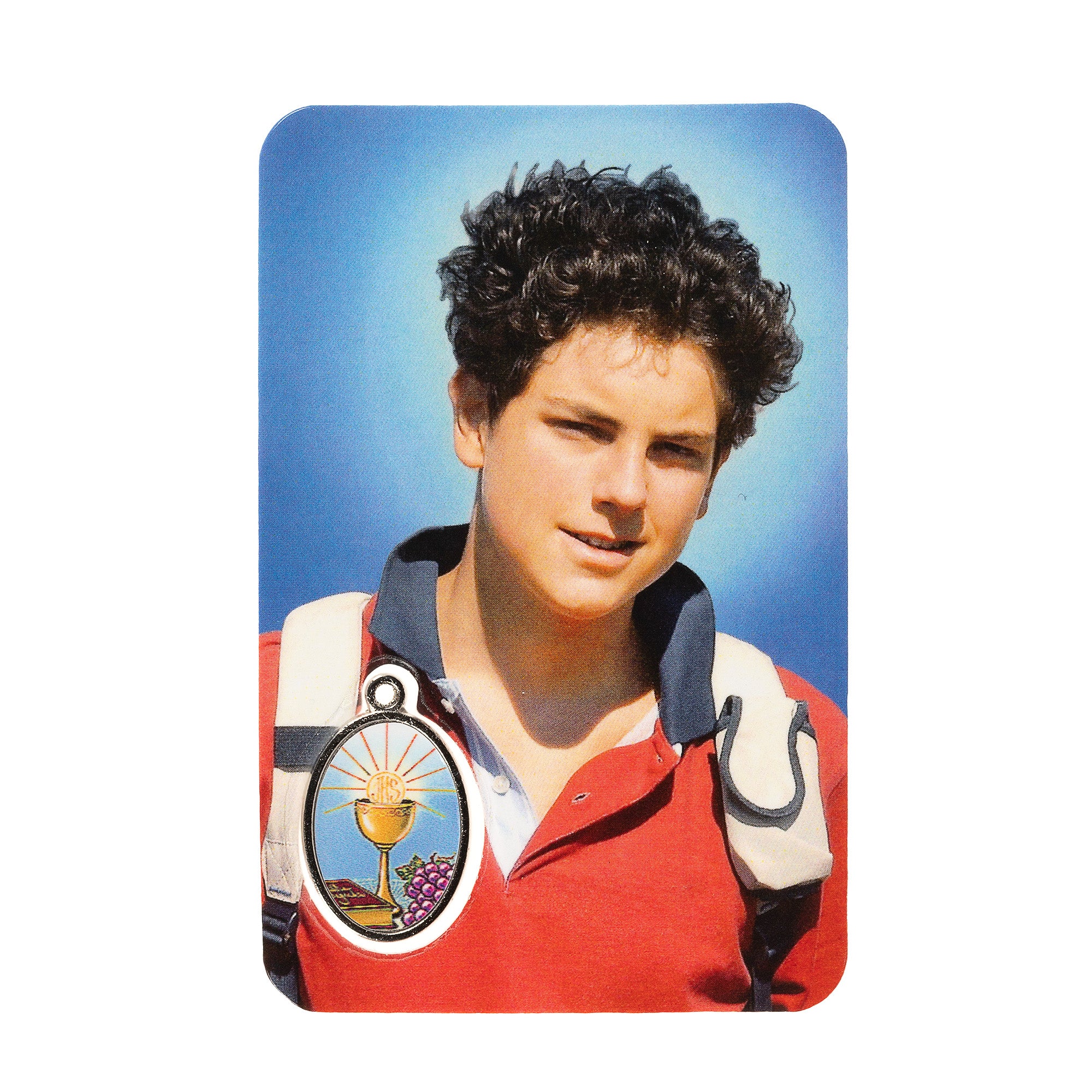 This handsome prayer card features his full color, photographic image, an intercessory prayer and Eucharistic medal on the back. The laminated card is a reminder and inspiration to holiness, especially for Catholic youth. Makes a great First Communion or Confirmation gift. Made in Italy.