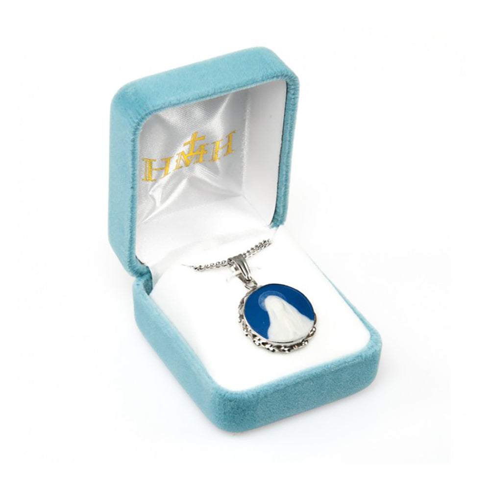 The Blue Cameo Our Lady of Lourdes Silver Necklace features a serene Marian relief in pastel blue Capodimonte porcelain, encased in sterling silver. Suspended from an 18" rhodium-plated stainless steel chain, this handcrafted piece embodies grace and devotion. Packaged in a deluxe velvet gift box, it's a timeless addition to any jewelry collection. Made in Italy/USA.
