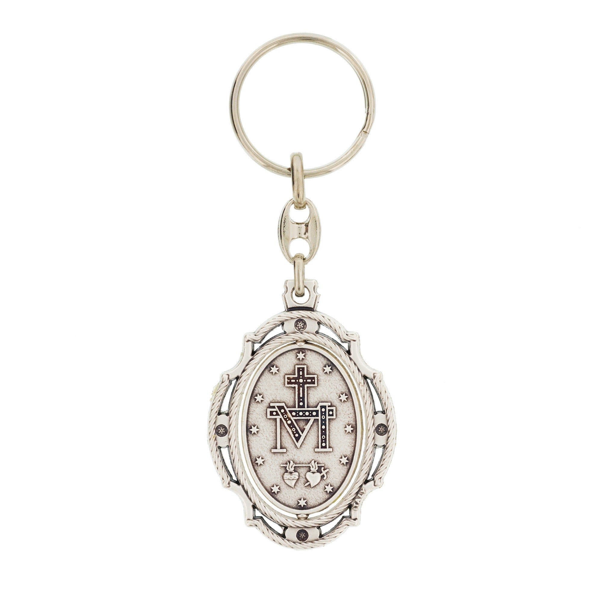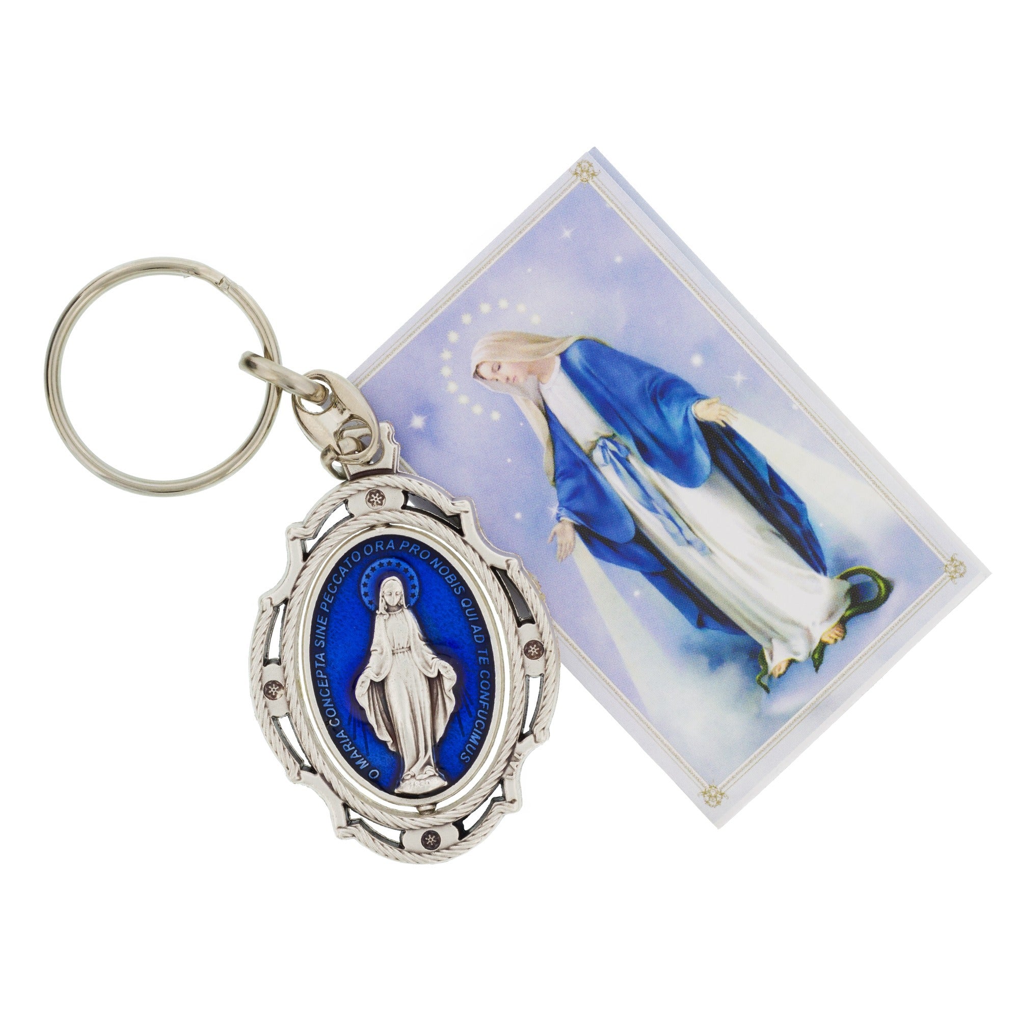 This keychain, imported from Italy, features a swivel Miraculous Medal. The Miraculous Medal features Our Lady on the front surrounded by the words, "O Mary Conceived Without Sin, Pray For Us Who Have Recourse To Thee" in Latin, made especially beautiful with the cobalt blue enamel in the background. The reverse of the Miraculous Medal features the M for Mary and the Cross intertwined, with the Sacred Heart and Immaculate Heart side by side underneath, surrounded by a crown of 12 stars. The Miraculous Medal is a great catechism in symbols and can function as a conversation piece while you're out and about. Makes a small yet thoughtful gift for family and friends for any occasion. The Miraculous Medal can also be blessed by a priest. Comes with a tiny booklet explaining the Miraculous Medal and includes Marian prayers.