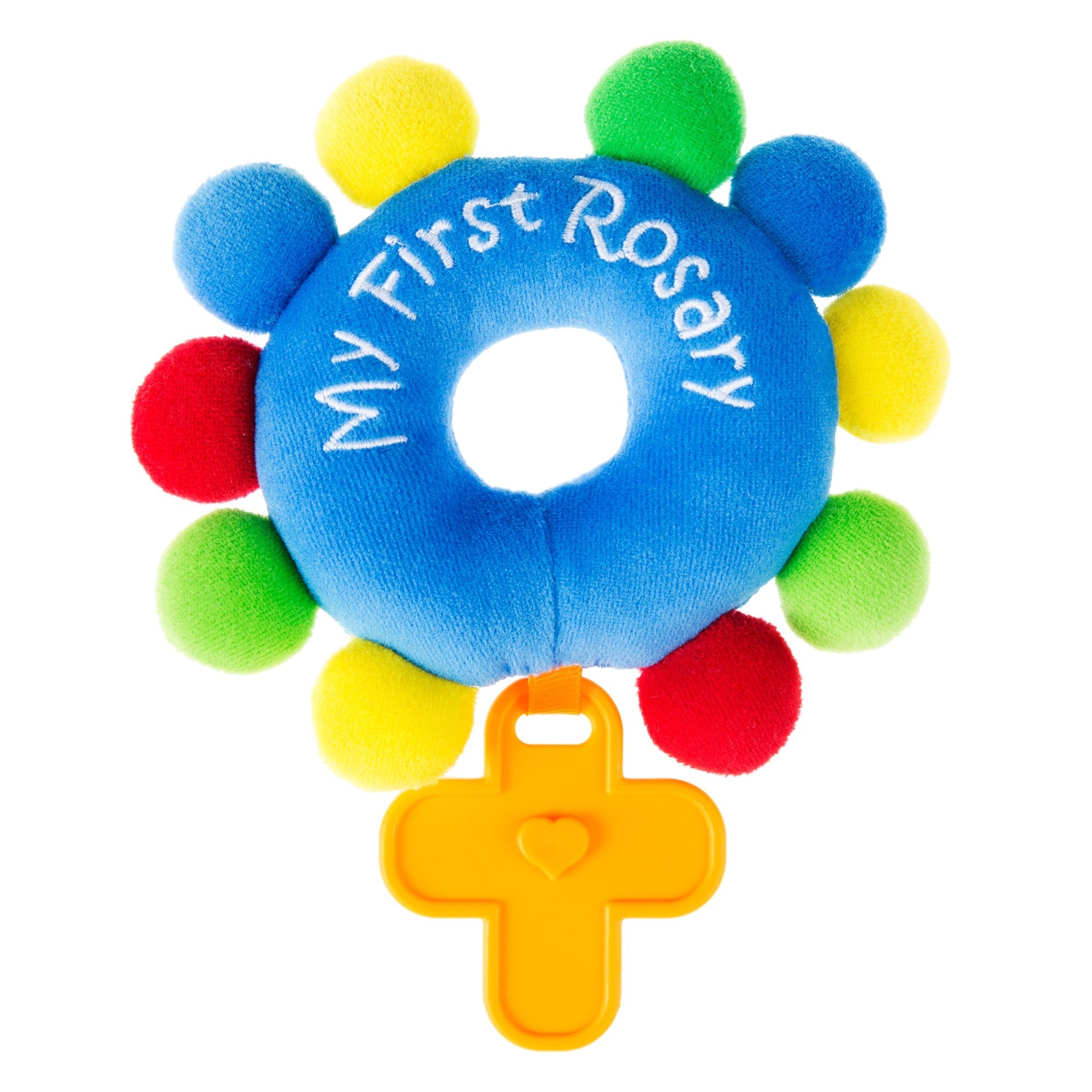 Brightly colored in primary hues and very soft, this plush toy can reach and teach the little hearts and minds of the littlest ones. Featuring 10 fluffy rosary beads and a cross teether, any baby will enjoy tugging, reaching for, and chewing on this plush toy. The accompanying tag includes information about praying the rosary. It’s never too early to develop a child’s devotion to the Holy Rosary. This plush baby rosary is safe and non toxic for ages newborn and up. Meets and exceeds all applicable U.S., Canadian, and European safety standards.