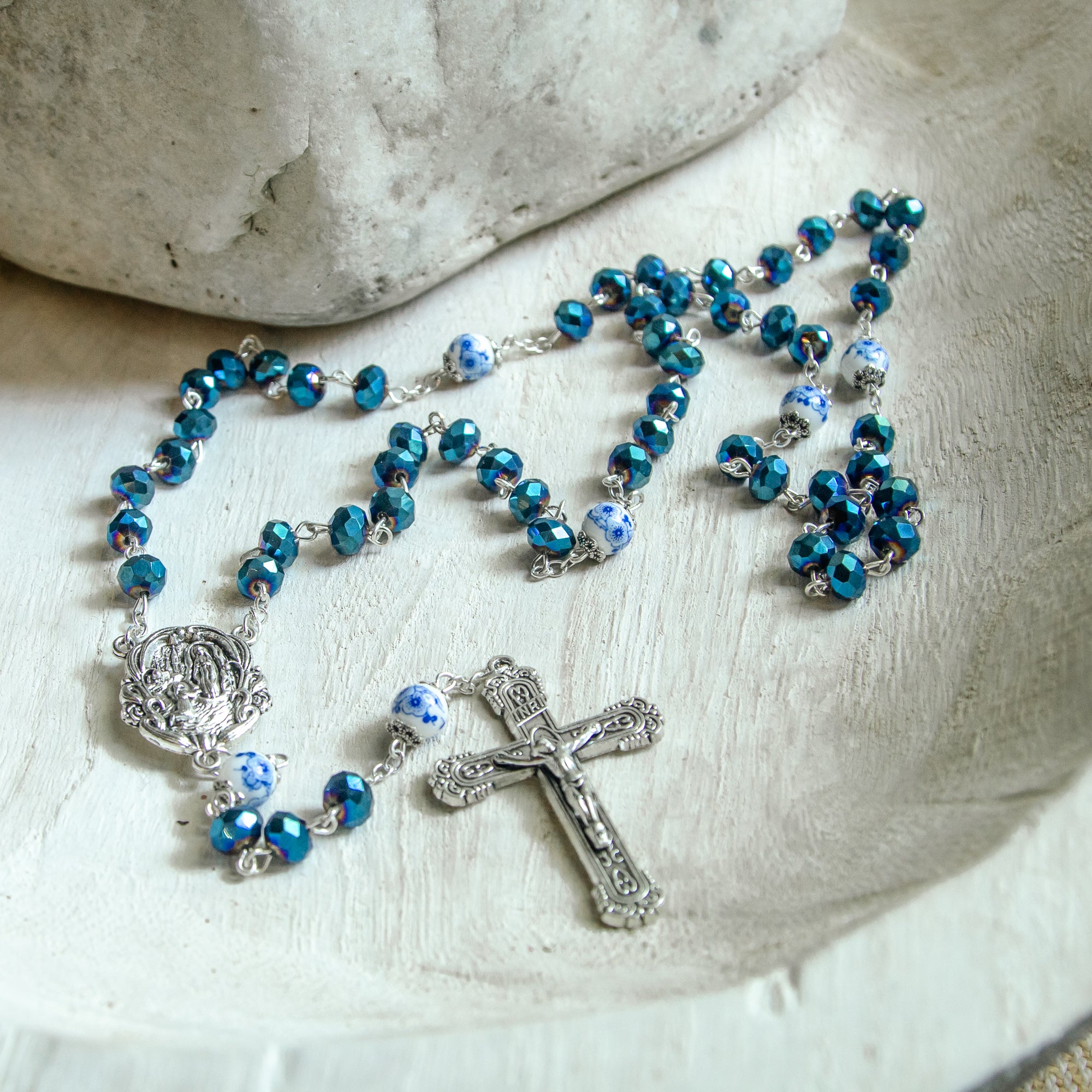 The Blue Sunburst Lourdes Water Rosary combines deep indigo sun-cut crystal Hail Mary beads with floral ceramic Our Father beads, accented in silver. Its centerpiece depicts St. Bernadette at the Lourdes Grotto, containing Lourdes Water. This 21" rosary, elegantly gift-boxed, is perfect for those devoted to Our Lady of Lourdes, offering hope and healing.