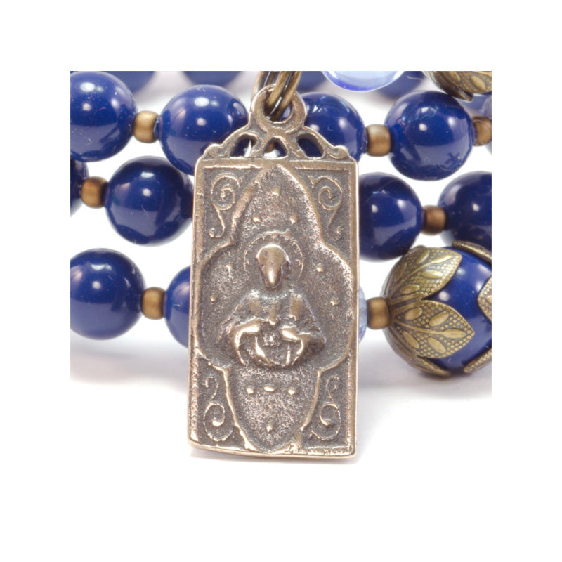 Lustrous blue Swarovski beads in lapis hues are strung together with antique bronze tone accents, creating a striking full rosary wrap bracelet. A distinctive, vintage Scapular Medal in antique bronze tones features Our Lady on one side, and the Sacred Heart on the other. An ornate Crucifix is the finishing touch. Strung on memory wire, the bracelet is easy to take on and off.