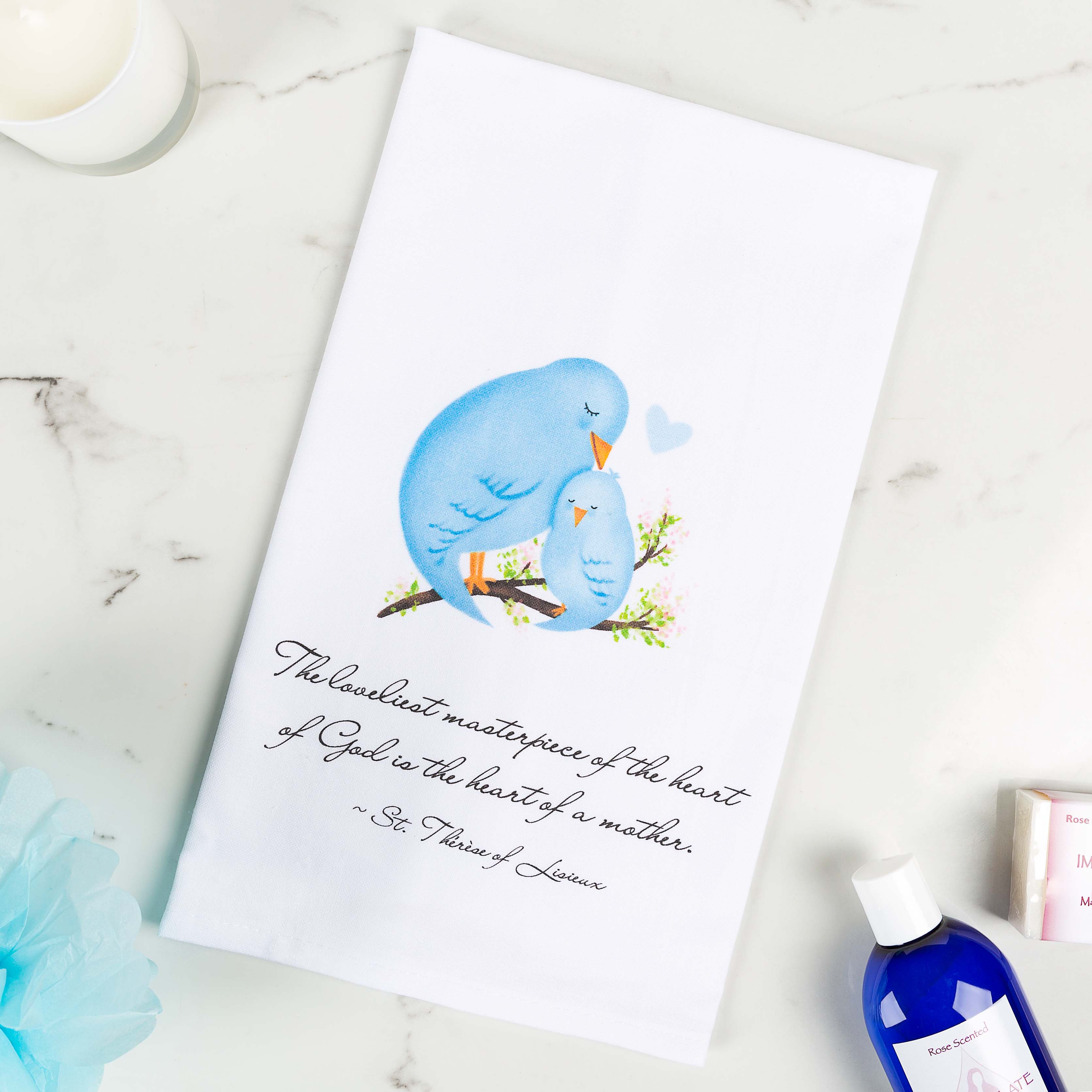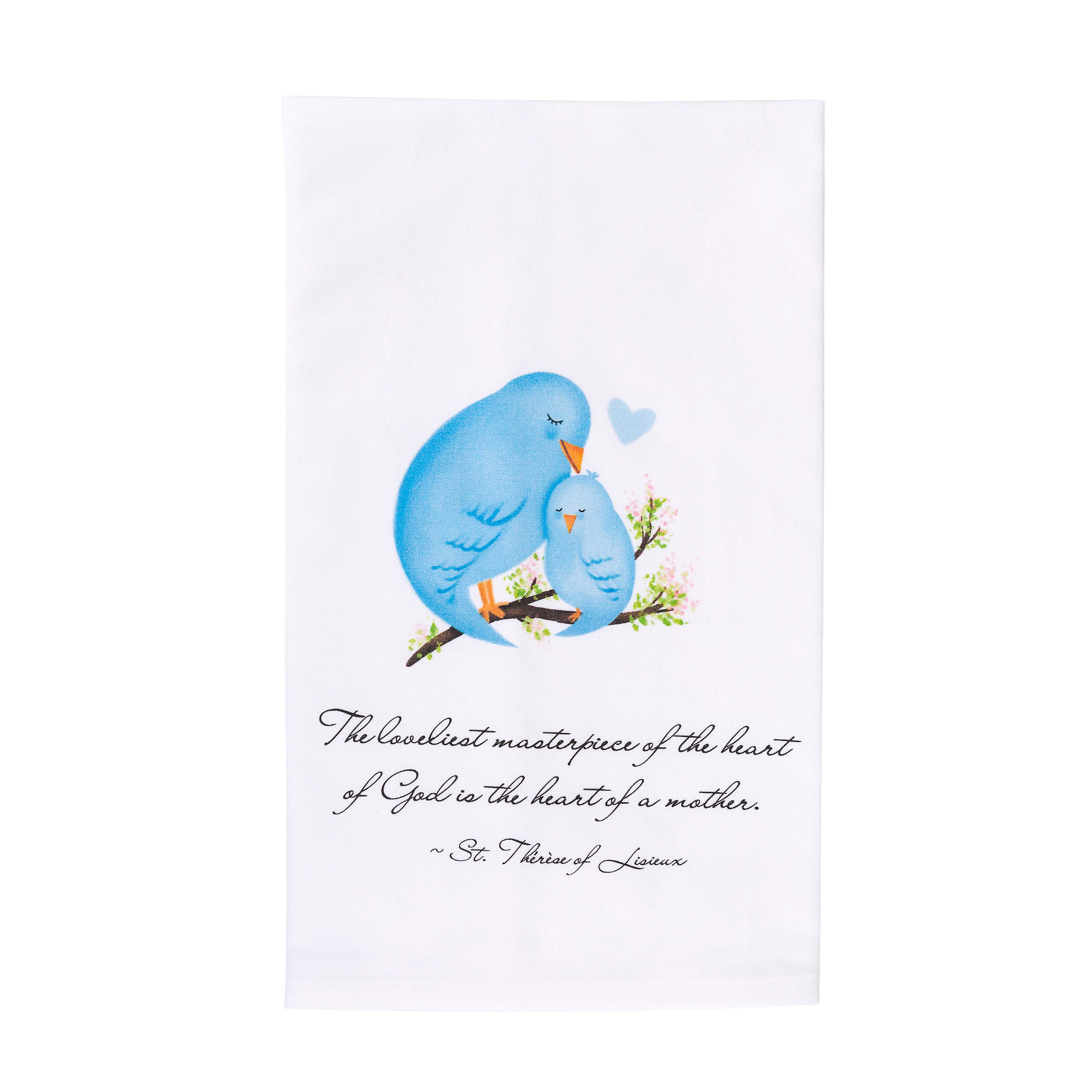 Celebrate Mother's Day with the charming Bluebirds Heart of a Mother Dish Towel. Featuring a delightful mommy and baby bluebirds image and a heartfelt quote from St. Therese of Lisieux, this exclusive towel from The Catholic Company is crafted with hand-stitched dotted embroidery. Made of 100% cotton for easy care, it makes a touching gift to honor the heart of a mother.