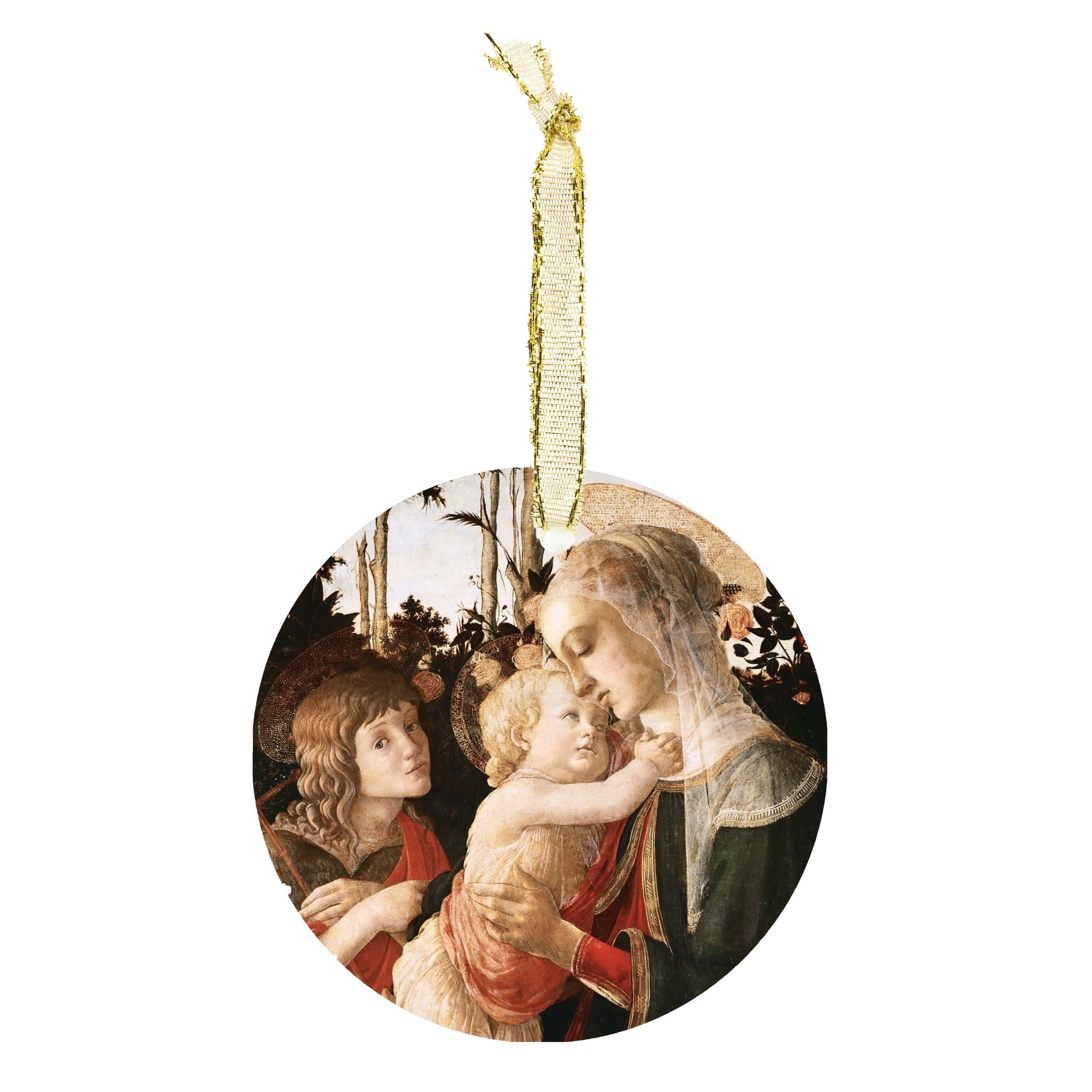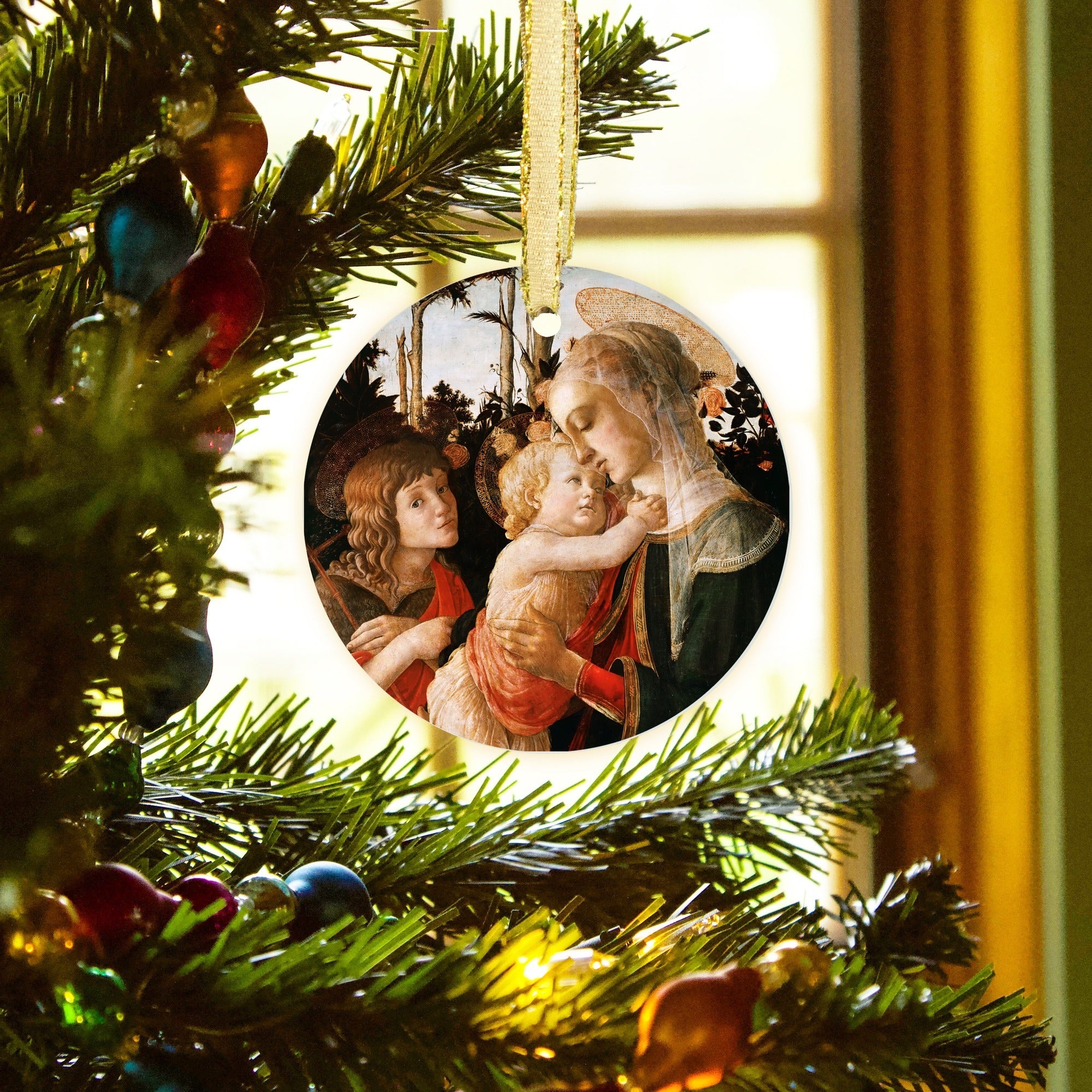 The Botticelli Madonna and St. John Ornament, crafted from sturdy glass, features an exquisite depiction of the Madonna and Child. Perfect for Christmas or year-round decor, it invites reflection on Christ's human family. Exclusively by The Catholic Company, this ornament includes a ribbon hanger and adds graceful elegance to any setting.