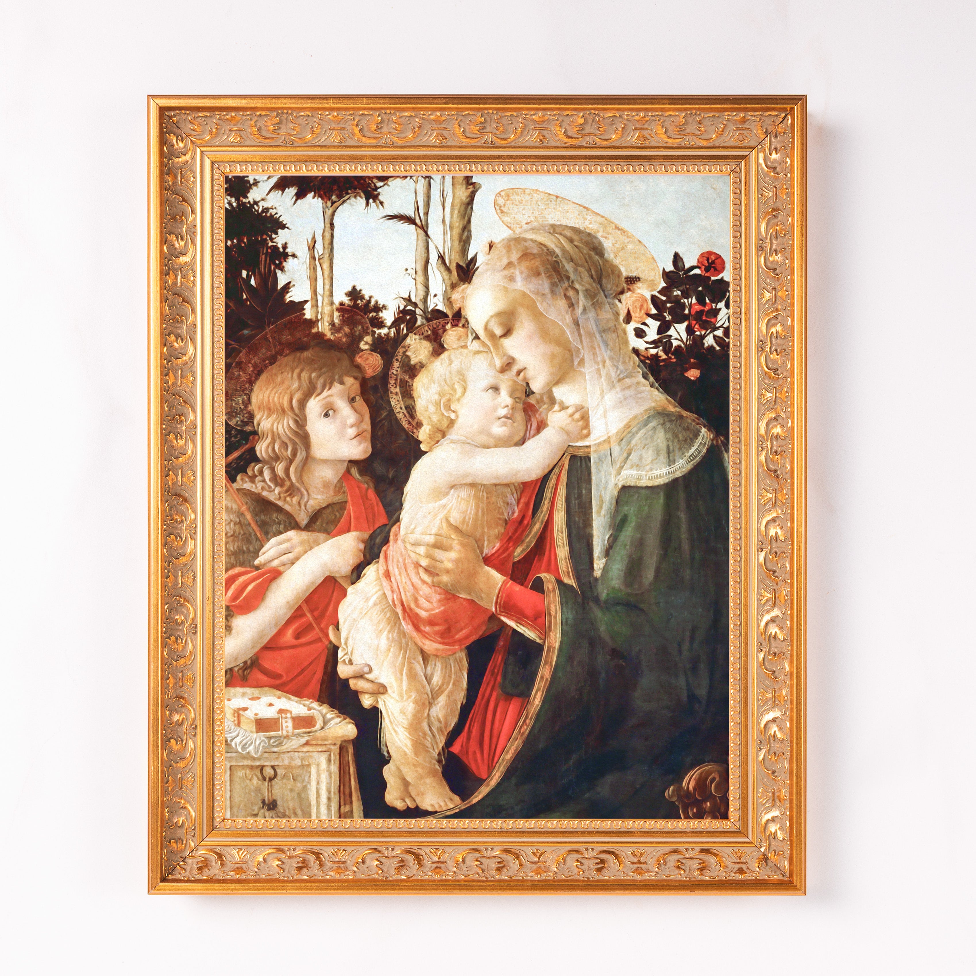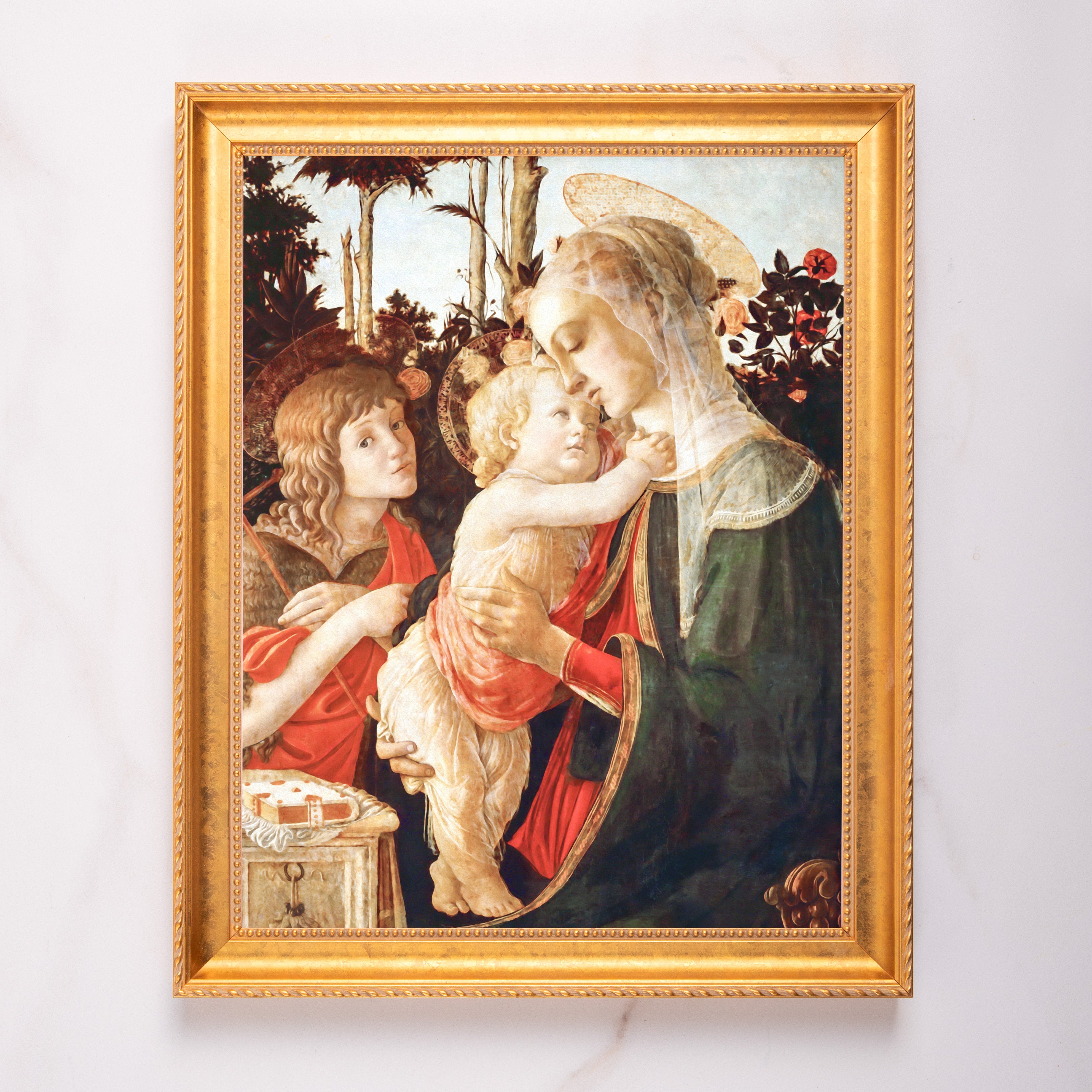 Featured here is Madonna & Child with St. John the Baptist, painted by Sandro Botticelli in 1467. Our Lady embraces the Infant Christ while a young St. John prays devoutly, eyes indicating a sense of what lies ahead. A reminder of Mary's motherly love and the sacrifice of St. John and the Christ, it's a striking image for devotion.