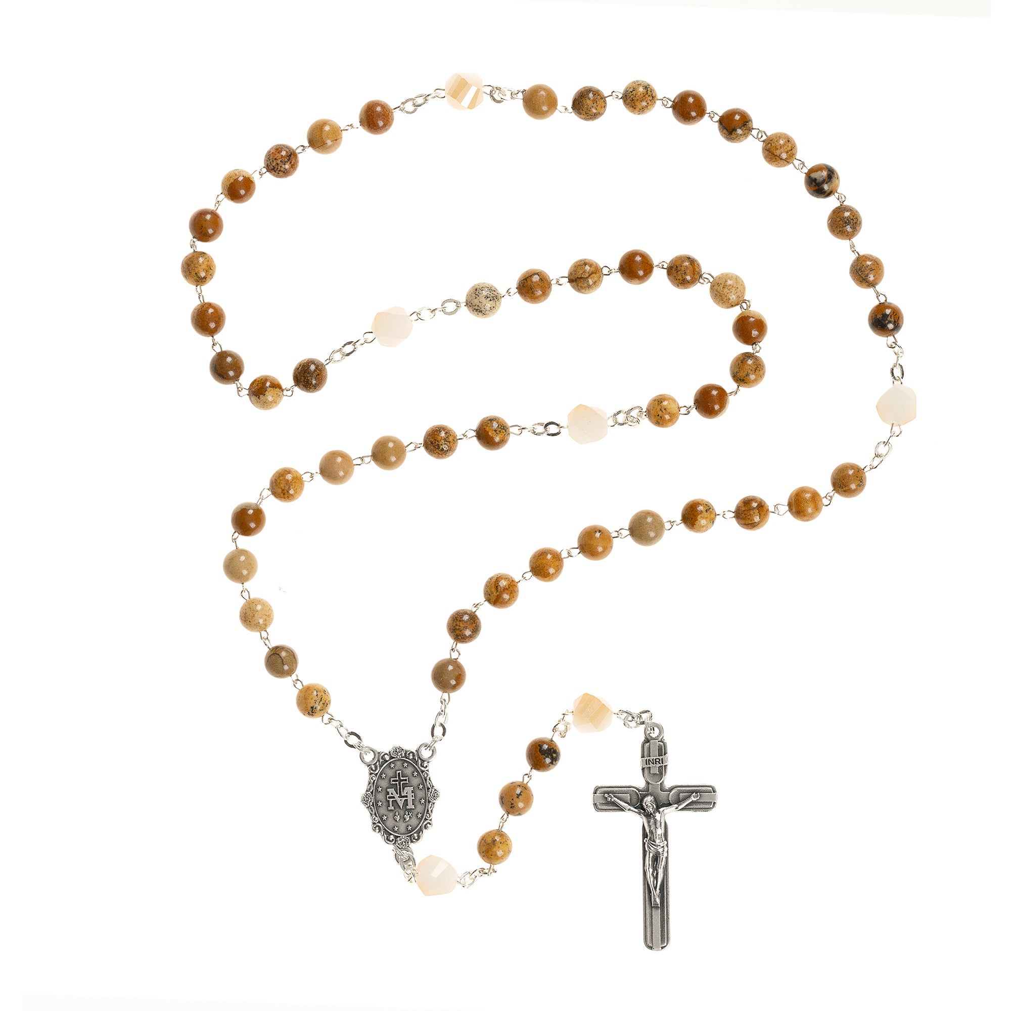 The unique rosary ranges in hue from rusty bronze, to brown-black, to ivory with a pink or orange undertone. The Hail Mary beads are round and dark, and the Our Fathers are faceted in lighter tones. An oxidized silver Miraculous Medal with lovely flourishes is the centerpiece. The Crucifix is simple yet elegant. Made in Italy, it includes a rosary prayer leaflet.