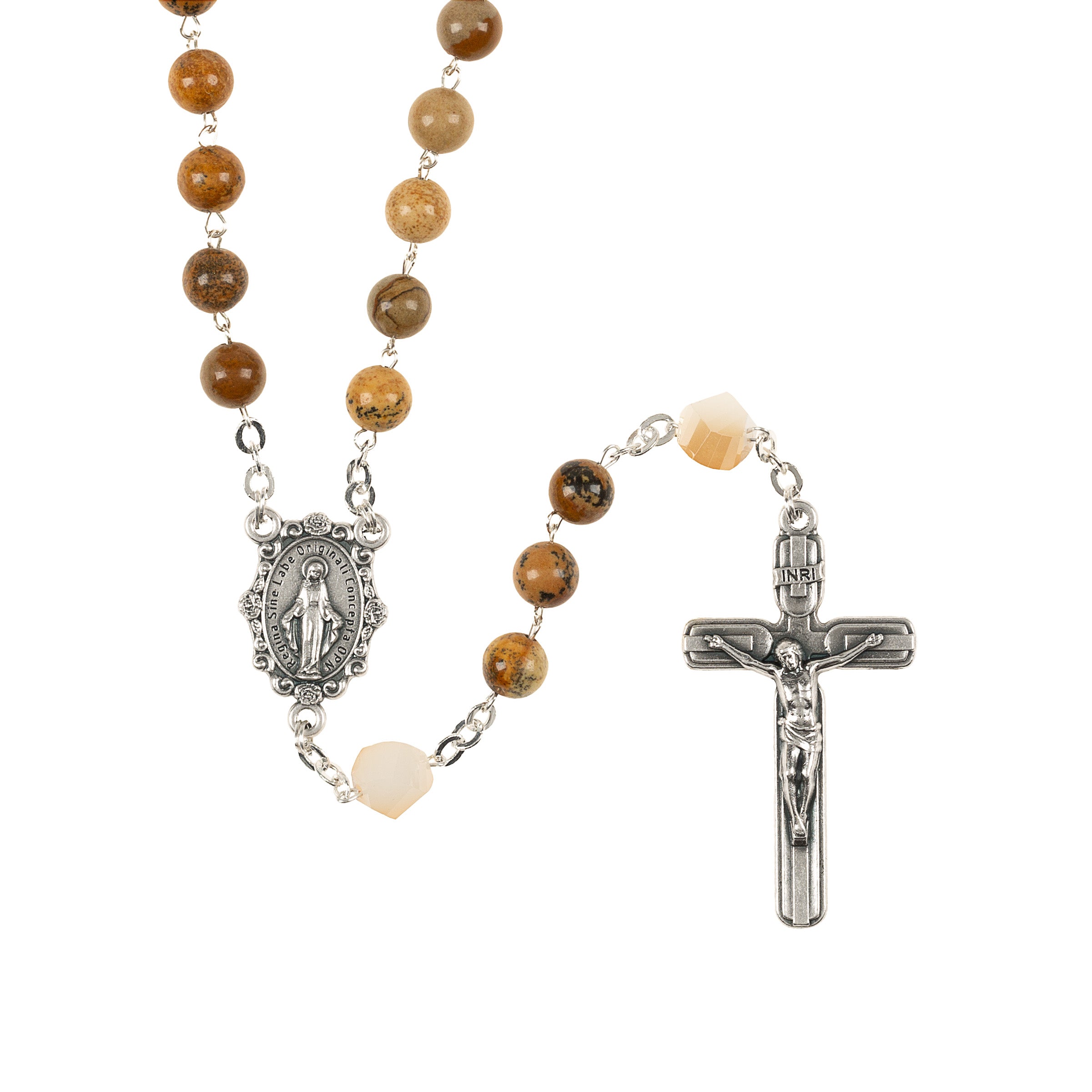 This distinctive Rosary is made of Paesina stone, first quarried in Italy by the Medici family in the 16th C. Used for furniture, decorative objects, and later as a painting surface, this ancient stone is a compressed limestone that develops color over time.