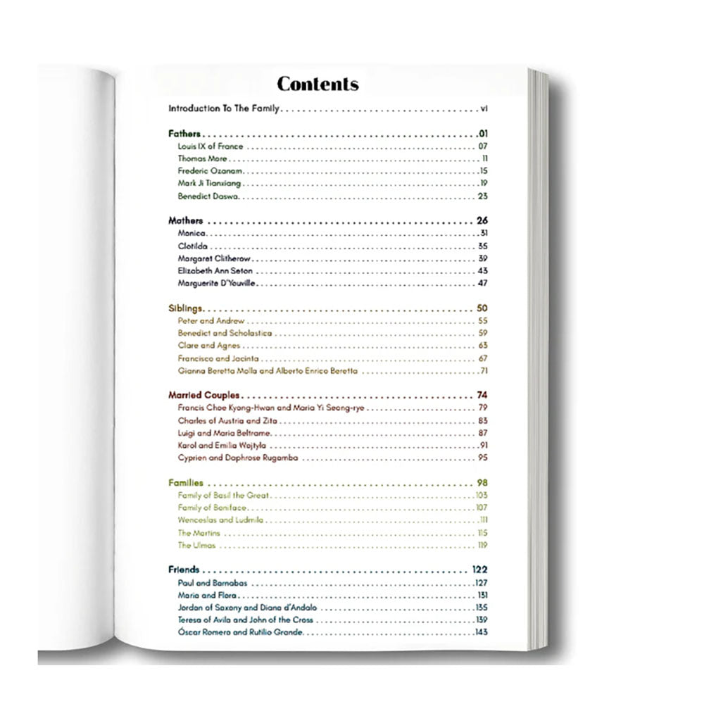 Each saint's story begins with a vibrant story designed to hook readers of all ages. Then, you will learn how the family played a critical role in their journey toward sainthood. Finally, each saint's section concludes with a prayer which asks for the saint's intercession as you and your family strive toward holiness.