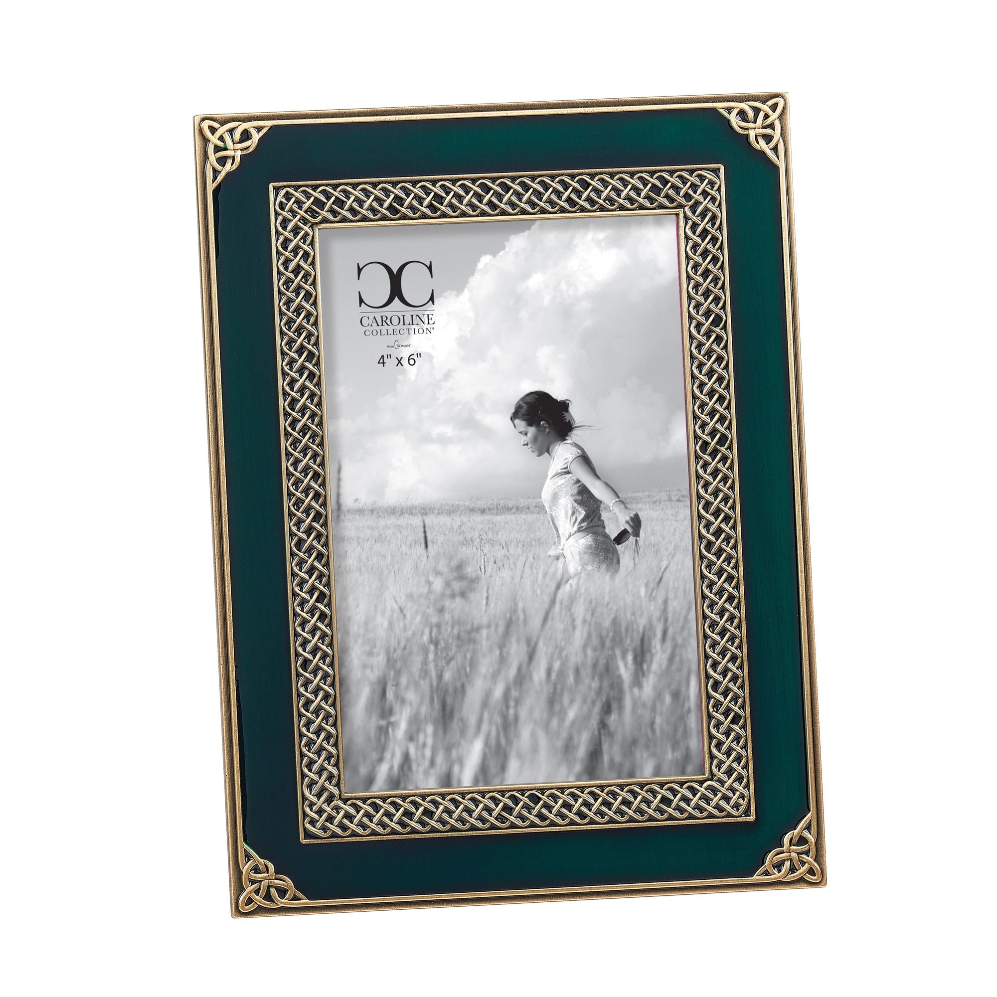 Celebrate Irish heritage and faith with this dark green metal frame, featuring ornate Celtic knot work and silver-tone accents. Designed to hold a 4" x 6" photo, the frame's intricate inset border and corner knots add depth and flair. Made from lead-free zinc alloy, it makes a stylish and practical gift for any occasion.