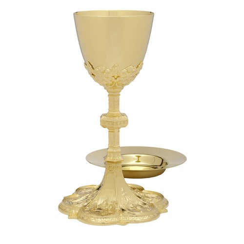 This ornately detailed chalice and paten set has so much detail and a rich feel. A baroque style design on the bottom of the cup that flows down the stem to the base makes this chalice visually intriguing. A large knob on the stem makes the cup easy to hold onto and lift. The chalice is sacred vessel used to hold the wine/precious blood. Accompanying paten holds the host/Holy Eucharist and makes a set. Available as all high polish gold plated or high polished cup with gold oxidized calyx, stem and base which will have some darkening/shadowing effects.