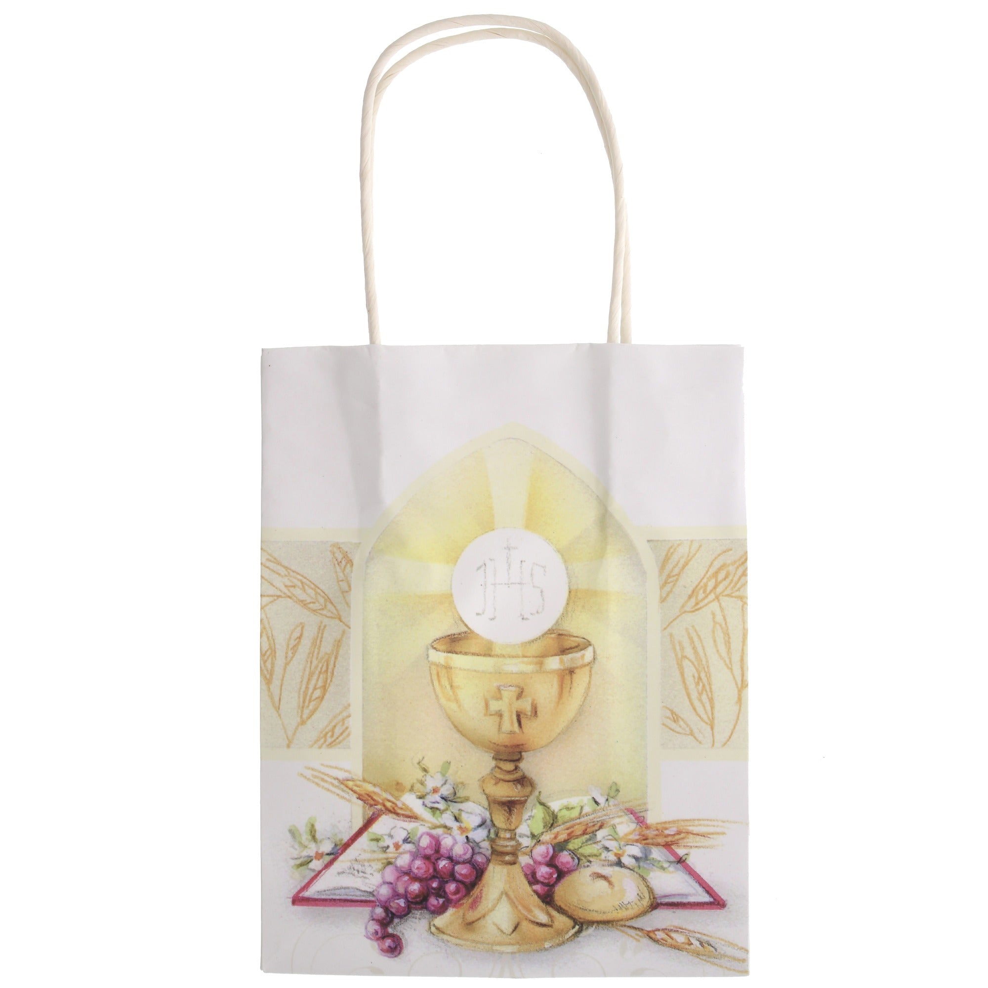 Present your First Communion gift in style with this Chalice Gift Bag. Featuring beautiful host and chalice imagery with a reverent and vibrant design, it adds a special touch to any celebration. Available in two sizes, this bag is perfect for making your gift memorable. Note: Tissue paper not included.