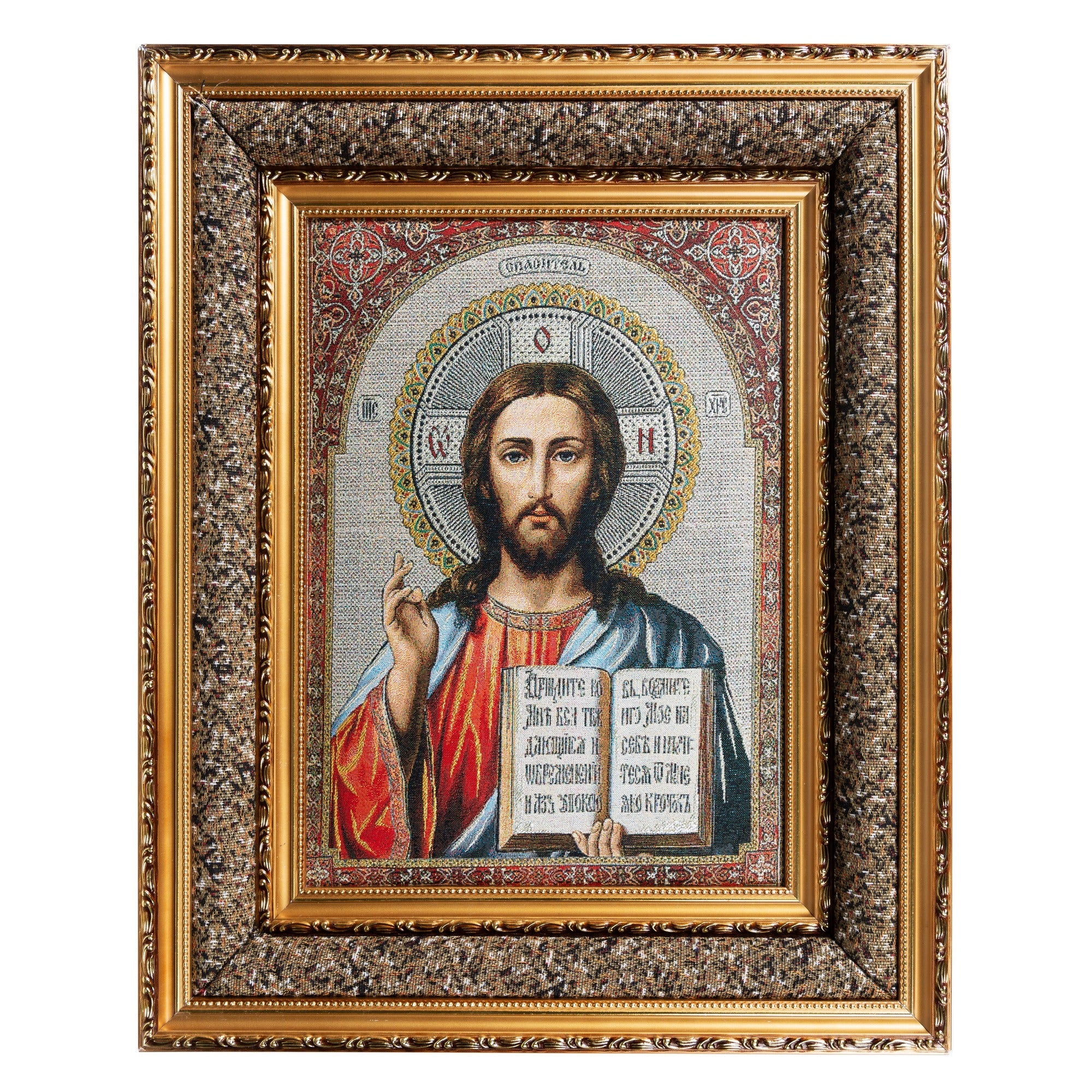 The Christ Pantocrator framed tapestry beautifully captures the ancient icon's serene elegance. Featuring soothing tones of golds, browns, oranges, grays, and white, it represents Jesus as the All-Powerful. Perfect for home or office, this piece honors God's strength, offering comfort and peace. Dimensions: 20.75" x 16.75" x 1.75".