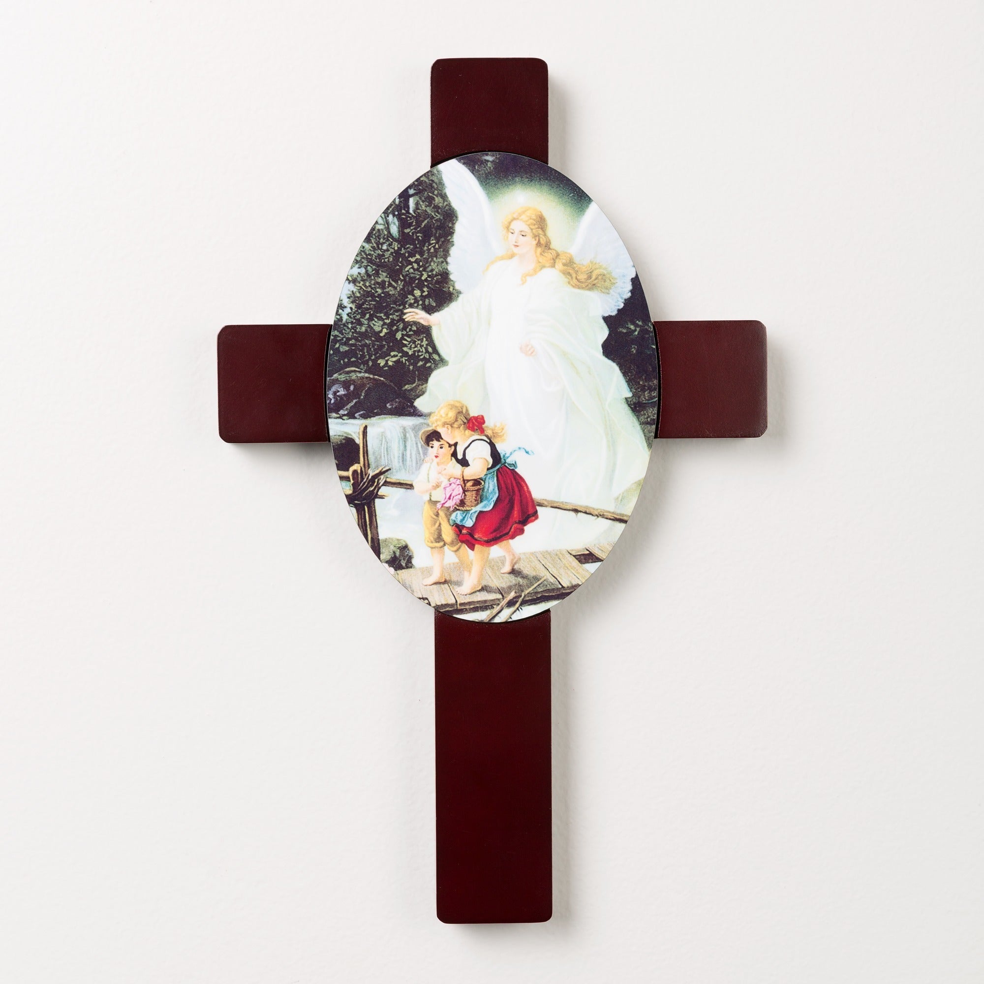 The Classic Guardian Angel Cross elegantly displays a cherished angelic image originating from a 1900 German postcard. Crafted from solid wood with a cherry finish, this 11" cross features an enamel overlay and is exclusive to The Catholic Company. Perfect as a gift for any age, it blends tradition with timeless appeal, inspiring protective thoughts.