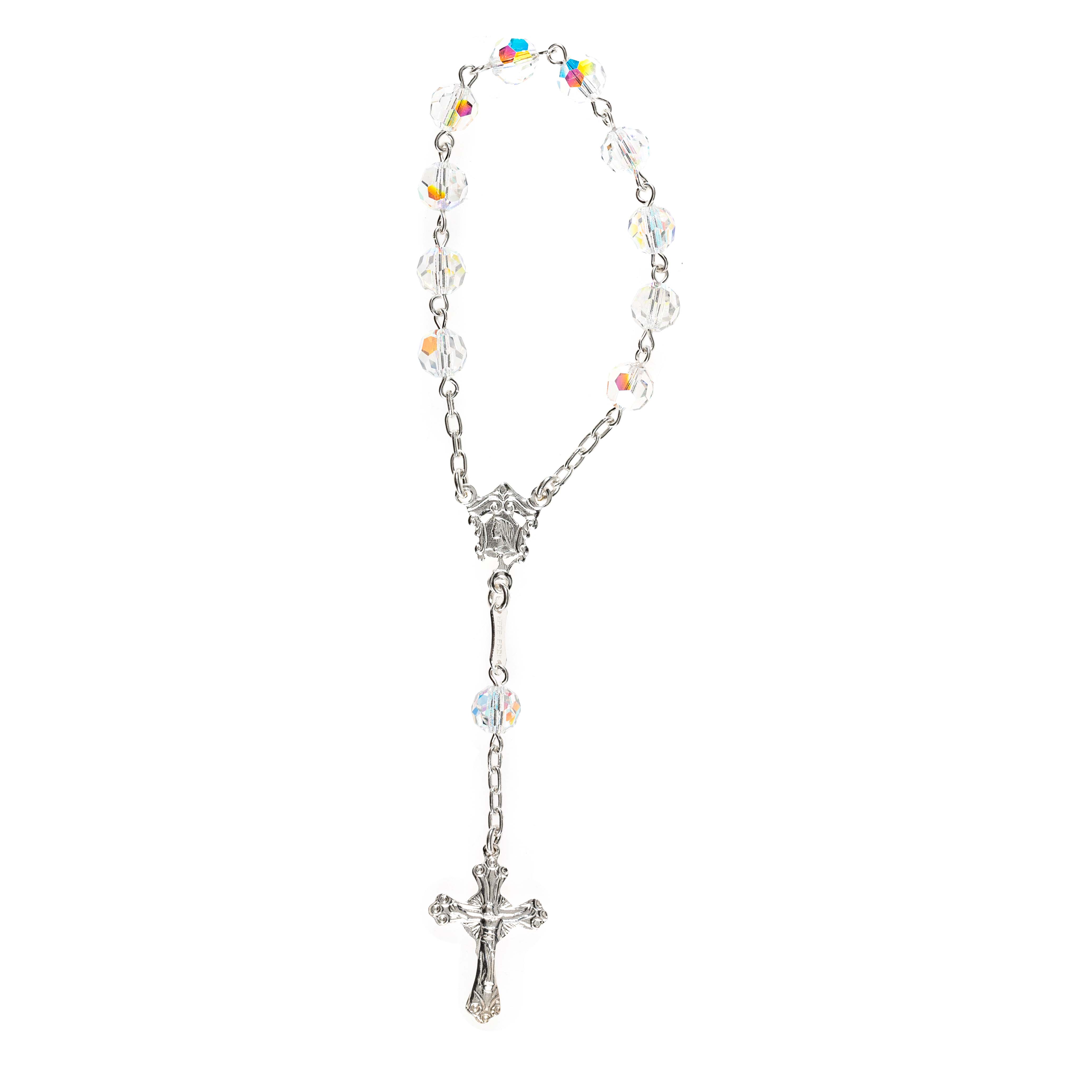 This exquisite one-decade rosary features clear, faceted Swarovski crystals with a captivating aurora borealis finish, symbolizing Our Lady's purity. Paired with a sterling silver centerpiece and crucifix, it offers a timeless expression of faith. Made in Italy, this rosary is both a stunning gift and a cherished devotional item. Personalization available on a silver charm.