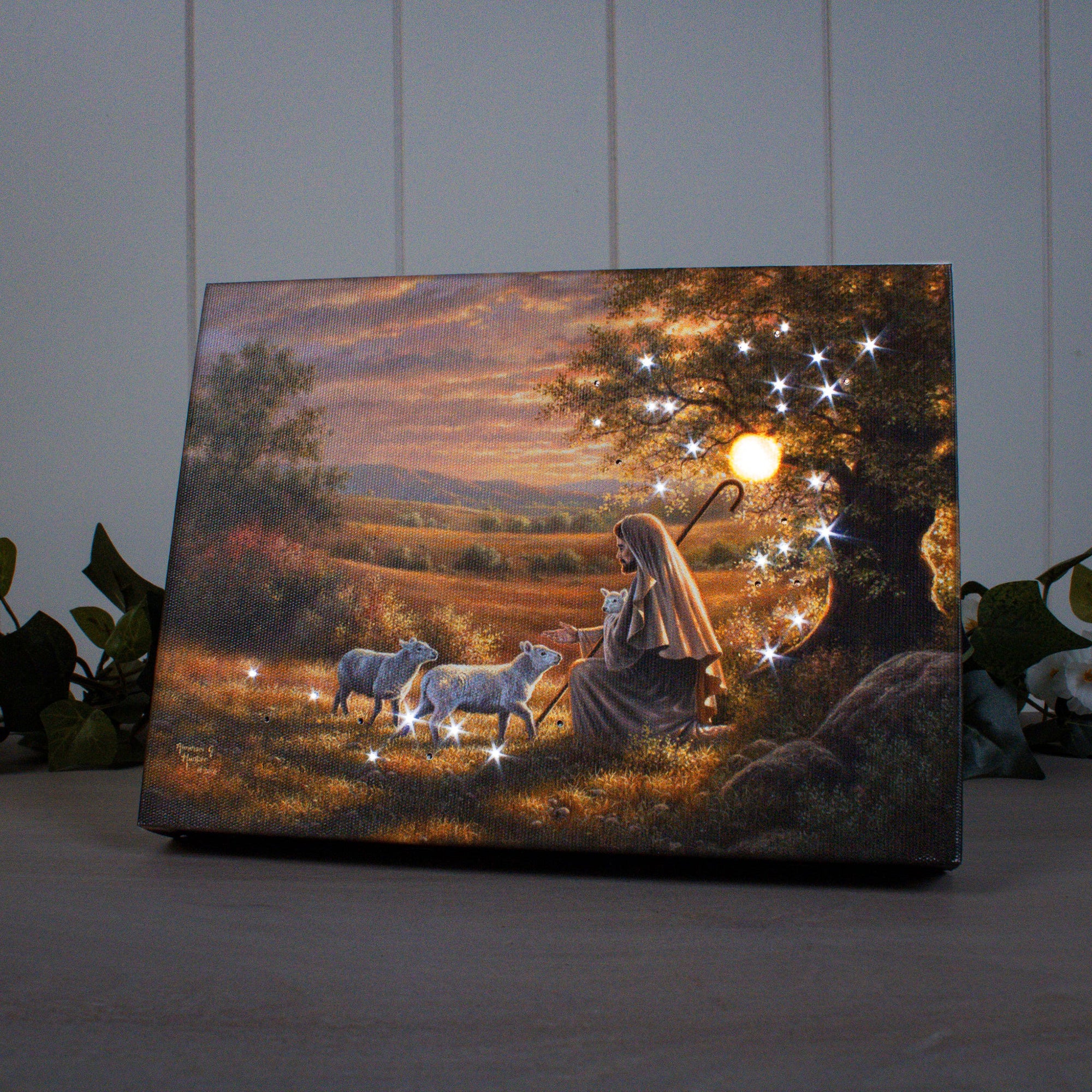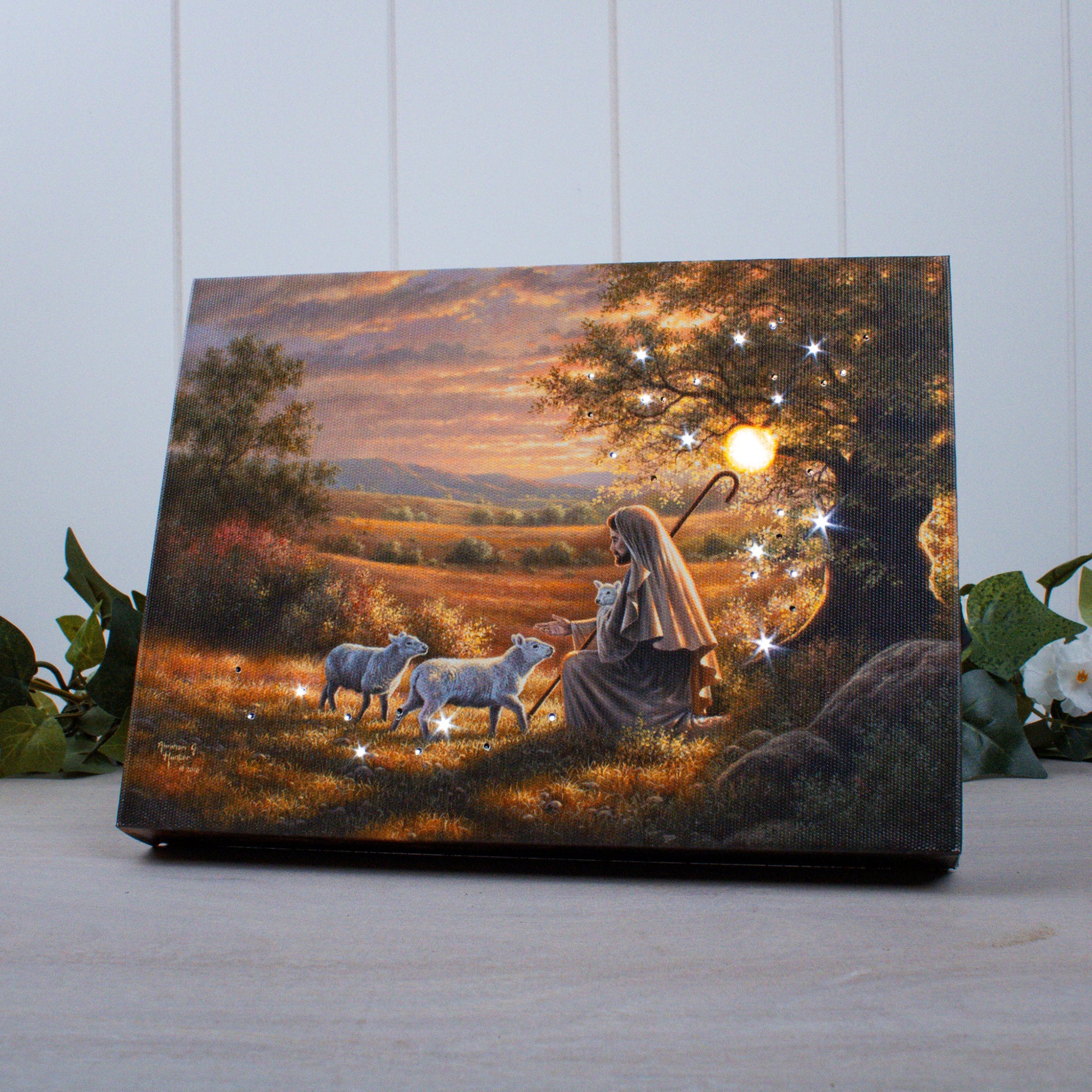 The "Come Unto Me" Lighted Tabletop Canvas features a serene image of Christ the Good Shepherd with a lamb and staff, illuminated by LED lights. This heartfelt piece casts a shadow of a cross, serving as a comforting and hopeful symbol. With an easel back and a 6-hour timer, it offers solace and encouragement as a gift or home accent. Requires 2 AA batteries (not included).