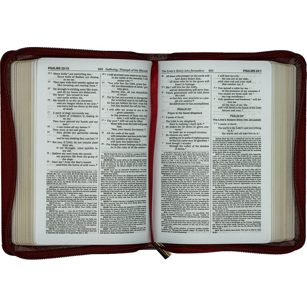 The Compact Size St. Joseph New Catholic Bible with Zipper Case is a beautifully crafted gift edition available in black or burgundy. Perfect for personal or group study, it features a reader-friendly translation, thorough footnotes, and various supplementary resources. Its convenient 4.5" x 6.5" size and durable binding make it ideal for travel, while the elegant design and presentation box make it a cherished gift.